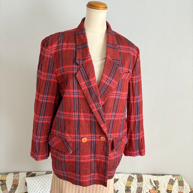 70s リネン 赤紫チェック柄 テーラードジャケット 昭和レトロヴィンテージ古着