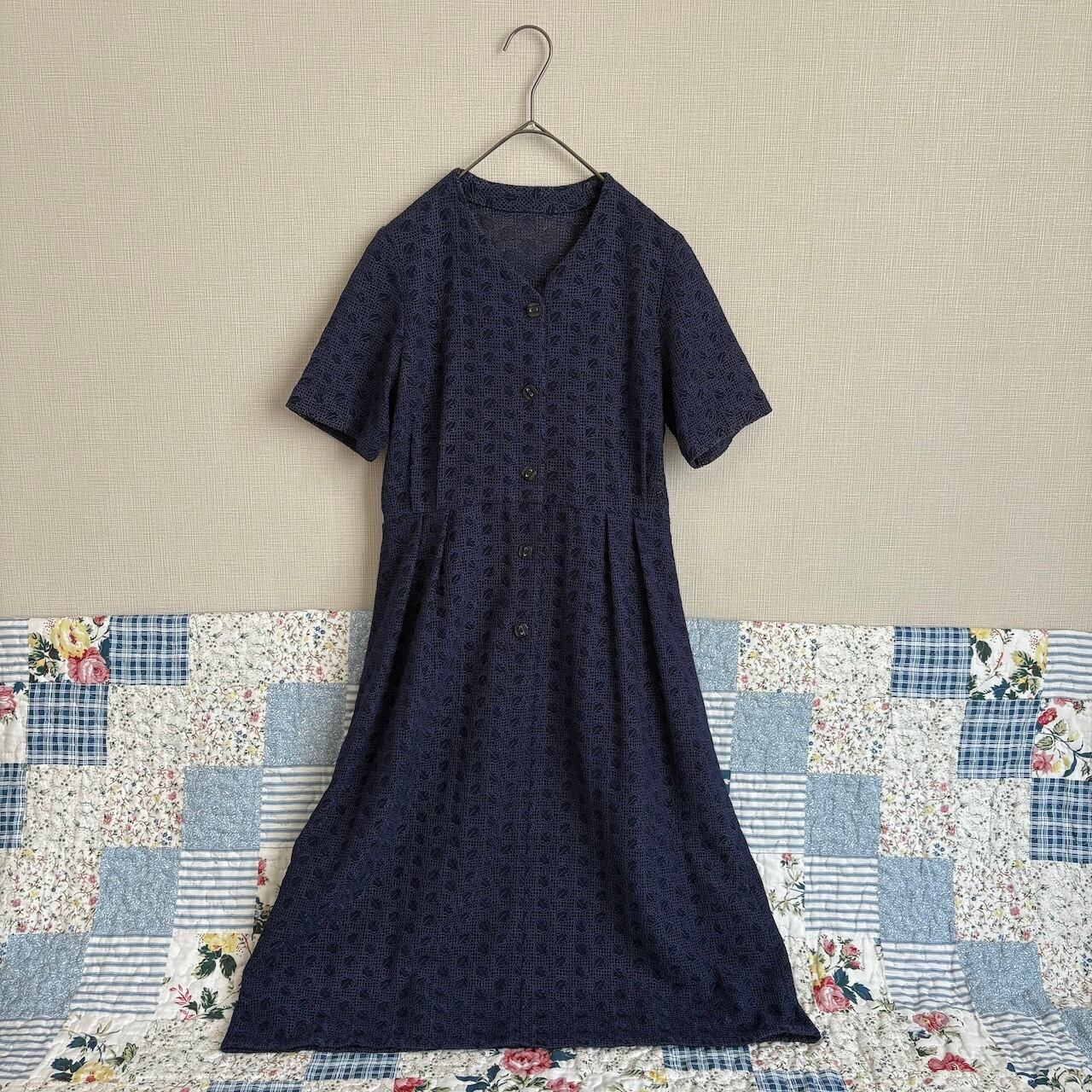 70s レース生地 半袖ワンピース ネイビー 昭和レトロヴィンテージ古着