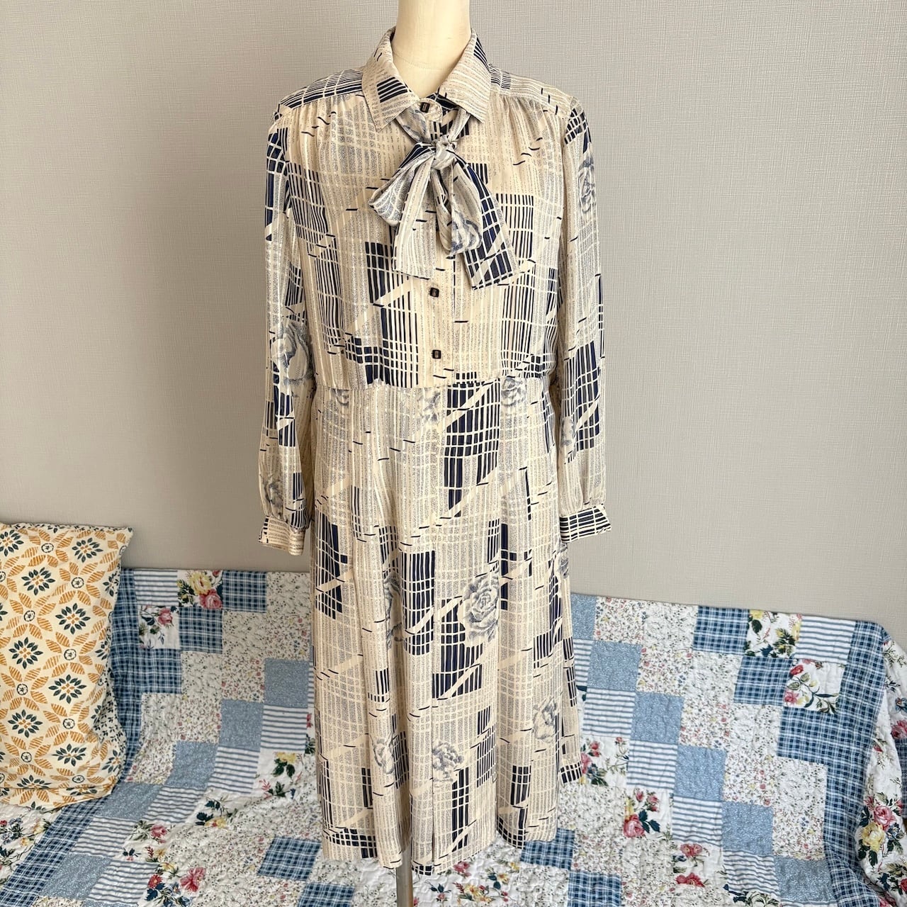 70s ボウタイ レトロ柄 クラシカルワンピース 昭和レトロヴィンテージ古着