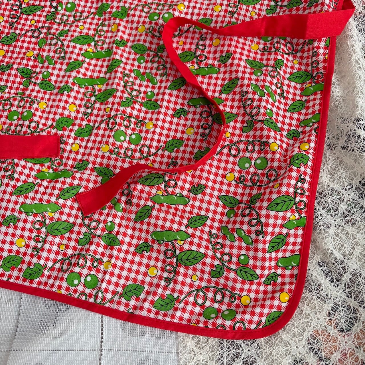 A cute and unique pattern featuring red gingham check and edamame beans!