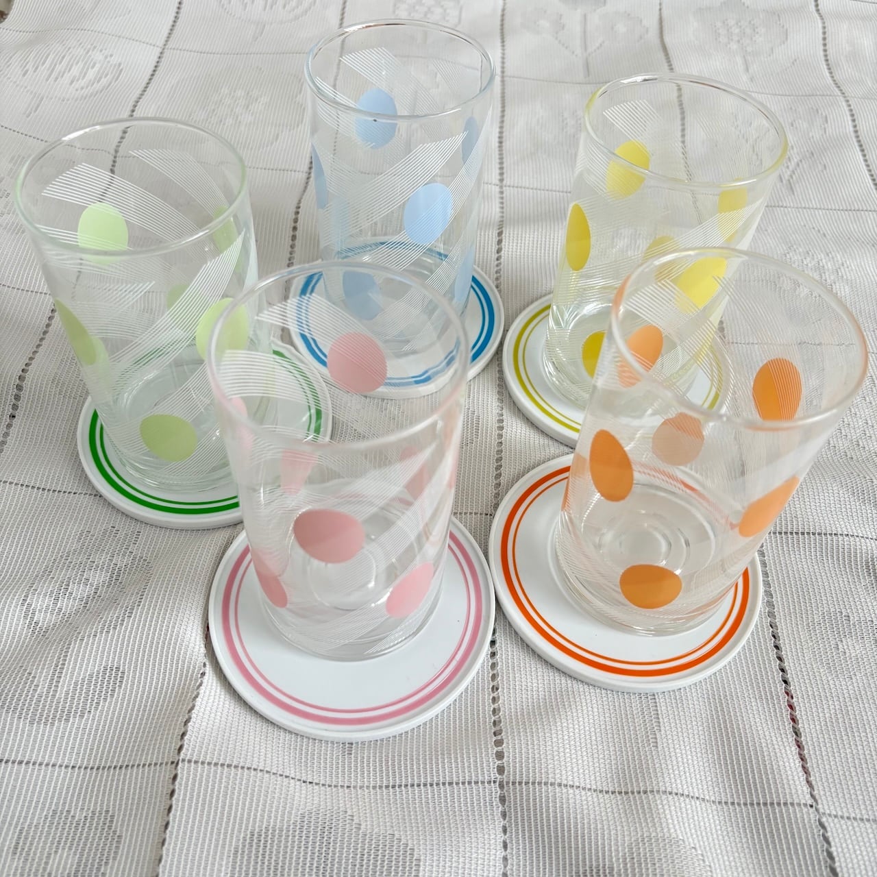 70s ドット柄 グラスとコースターセット 全5色 昭和レトロヴィンテージ食器