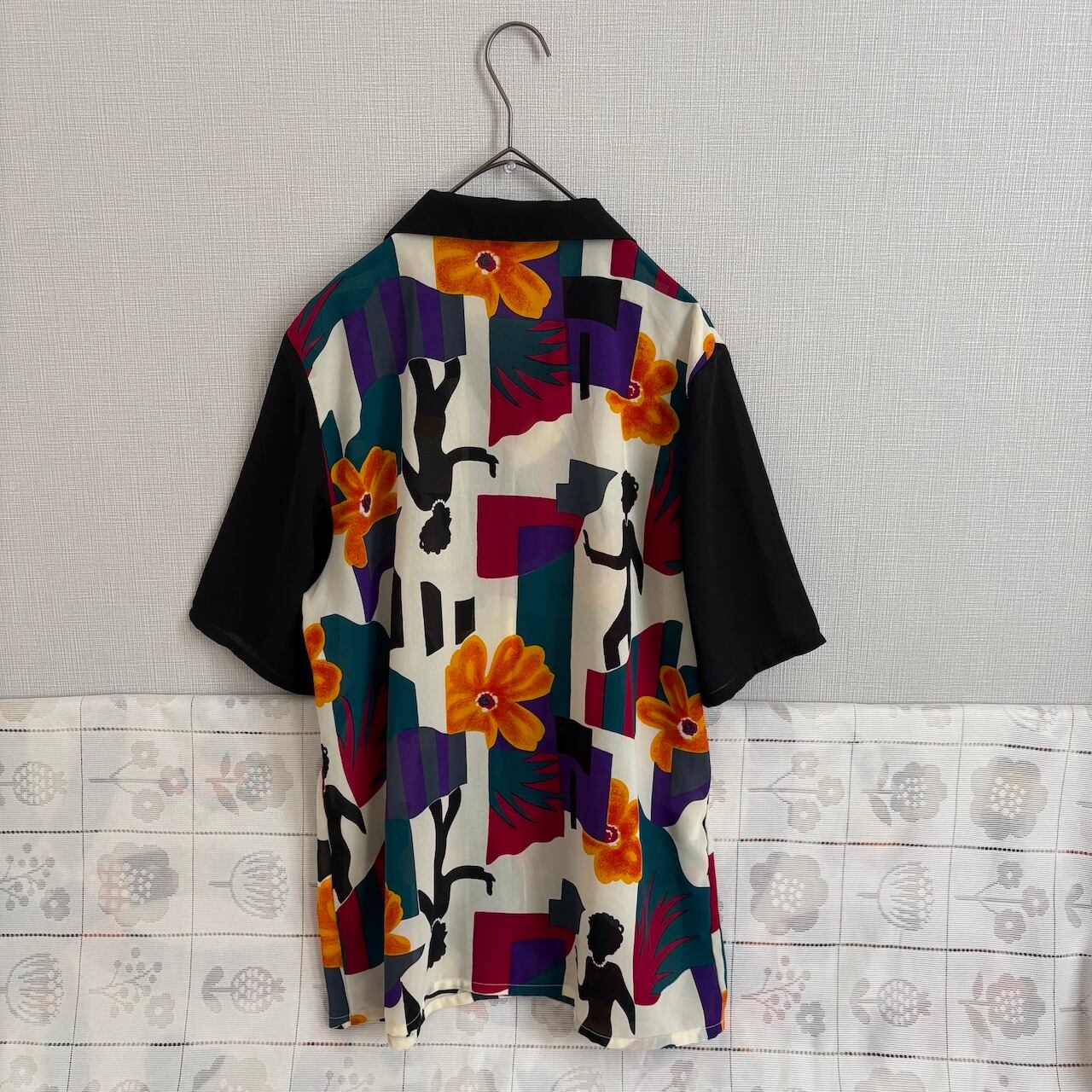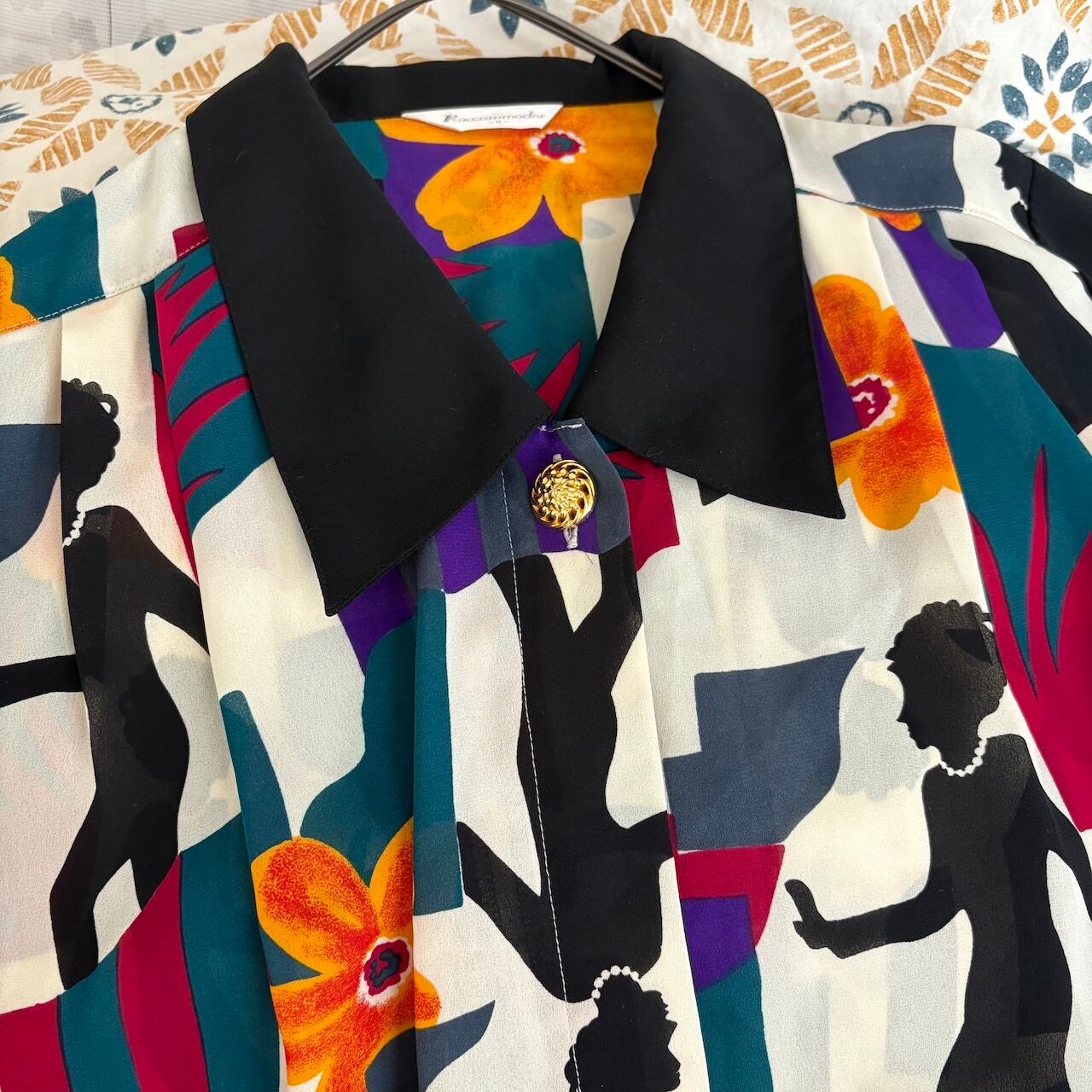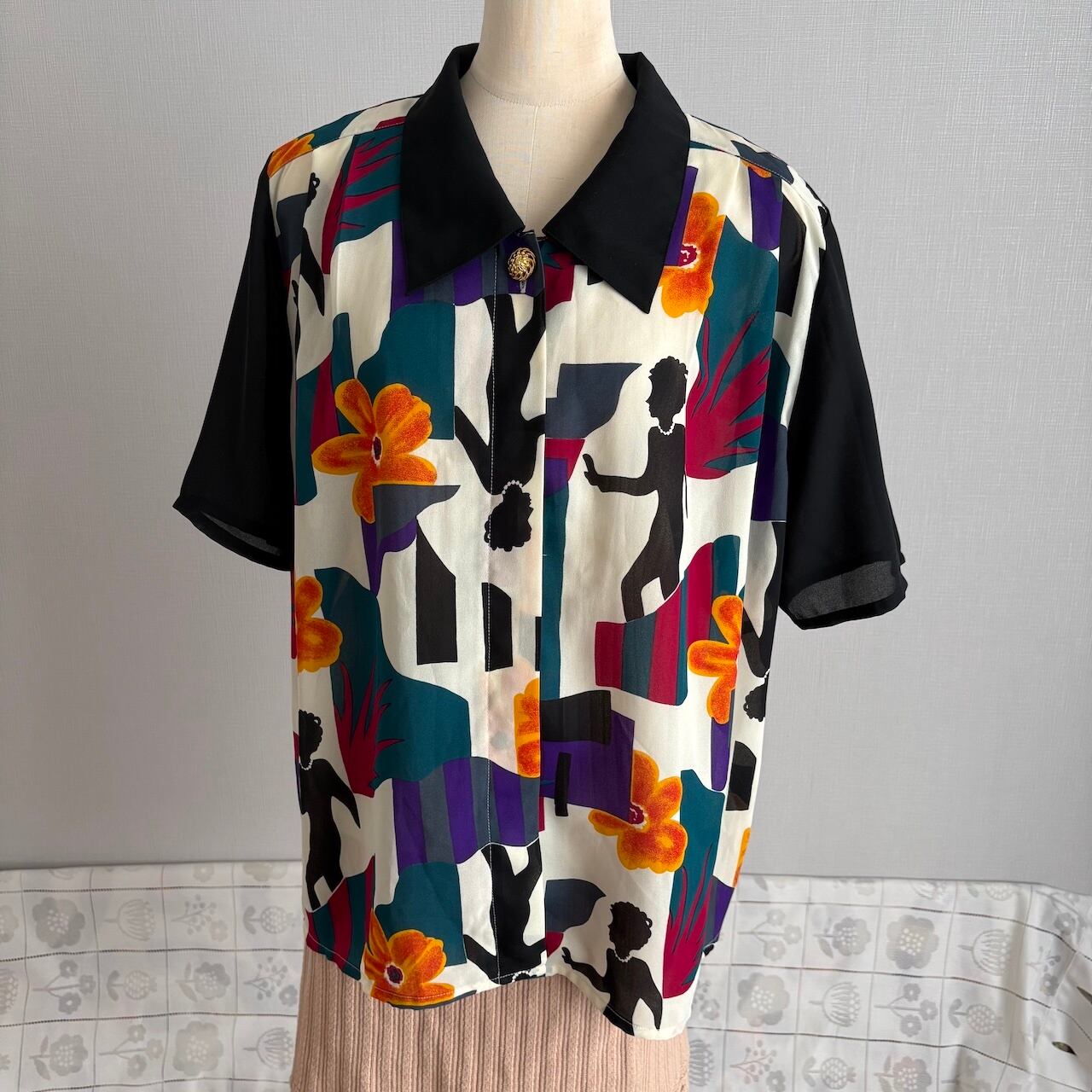 80s 襟付き柄 シアー半袖ブラウス 昭和レトロヴィンテージ古着