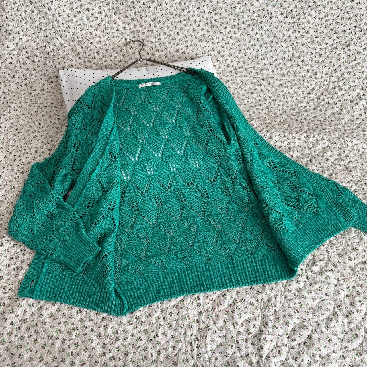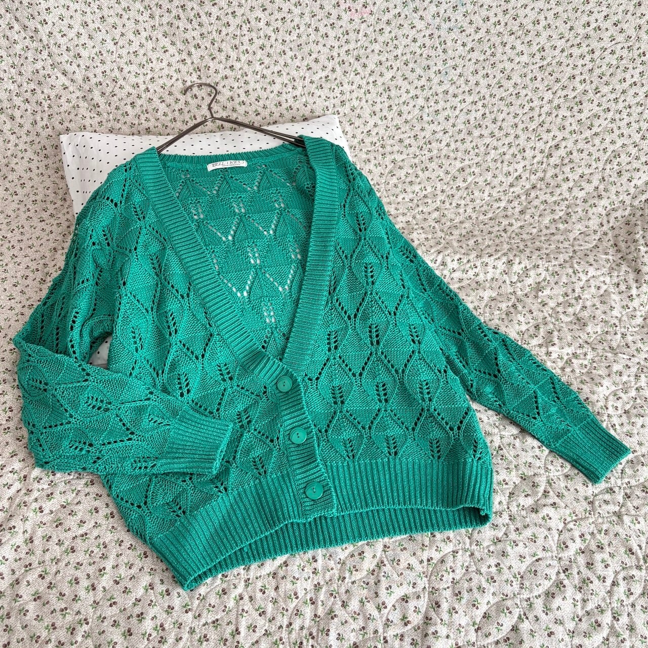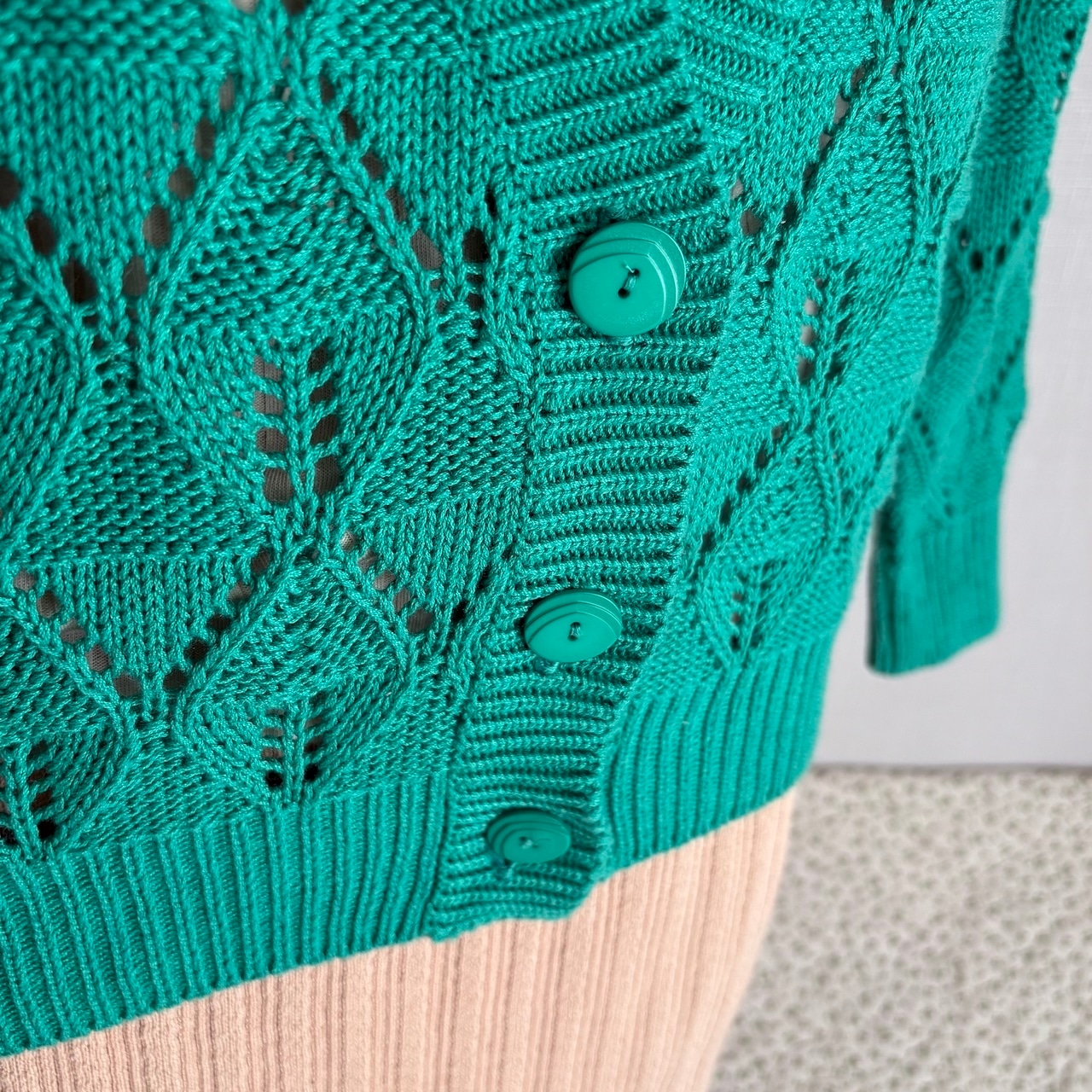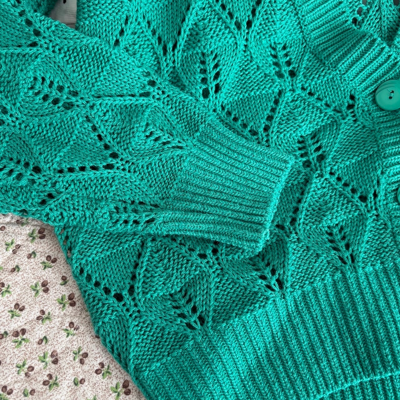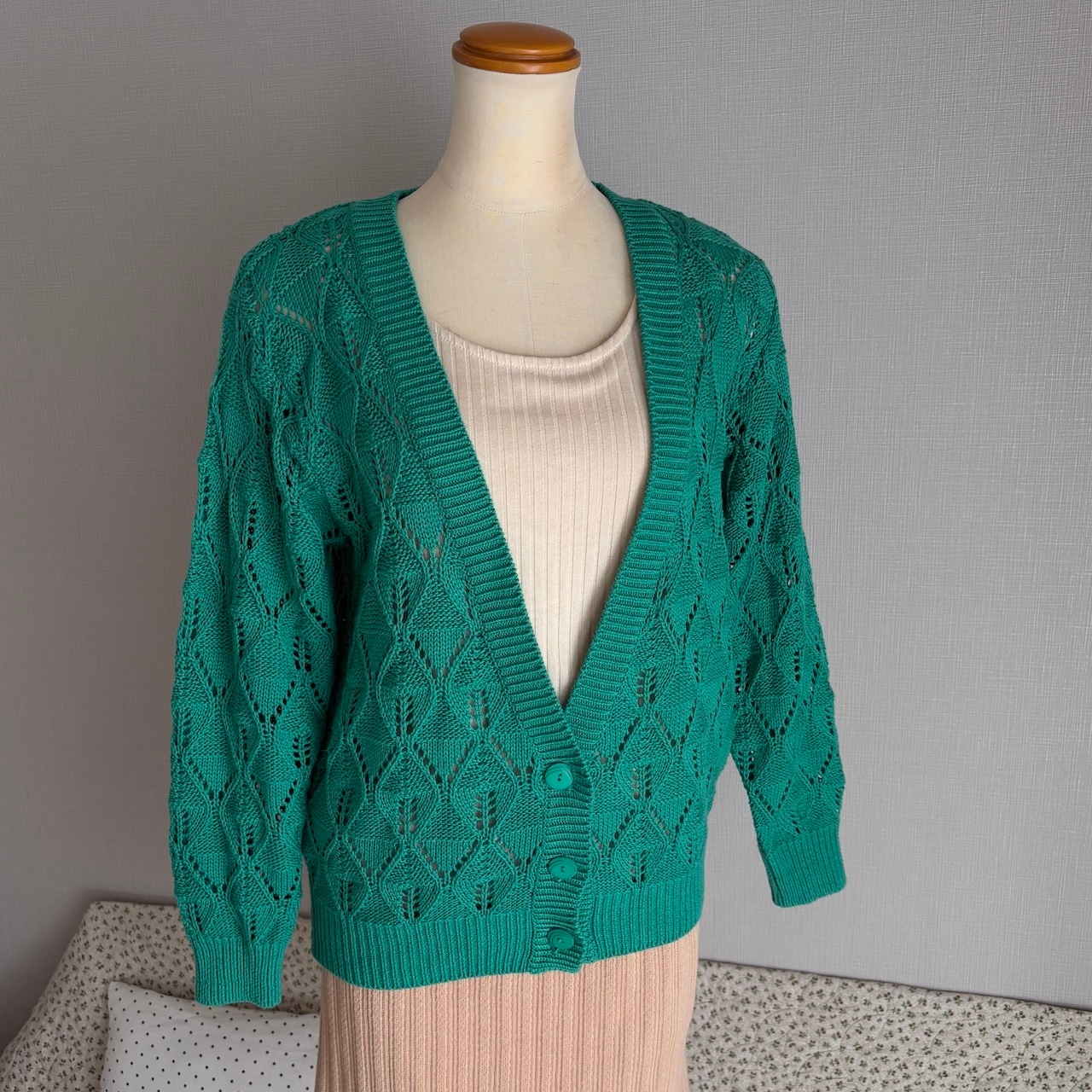 80s エメラルドグリーン 飾り編み ニットカーディガン 昭和レトロヴィンテージ古着