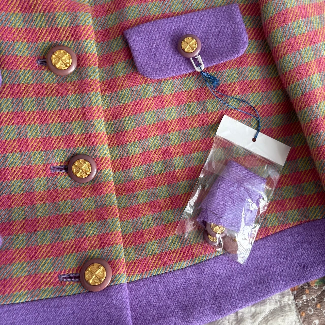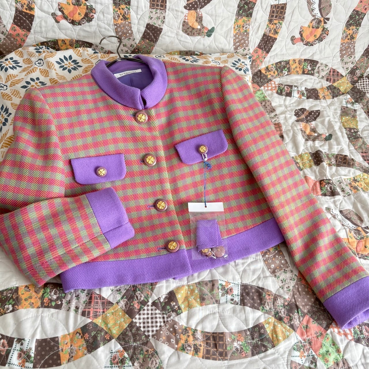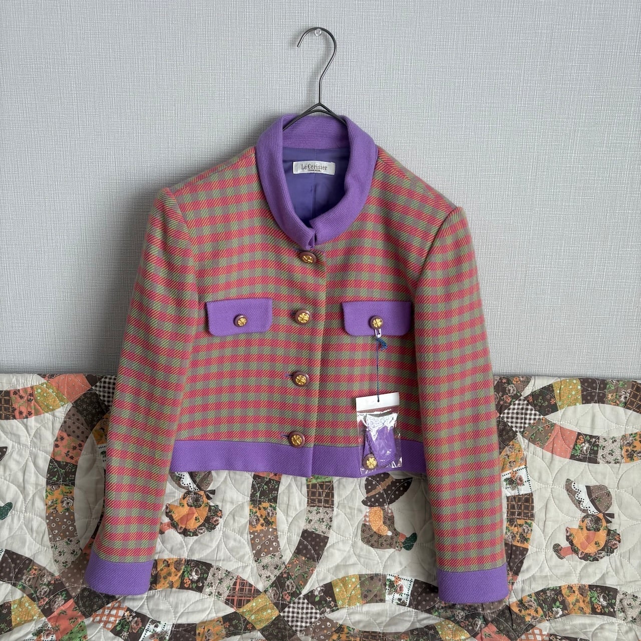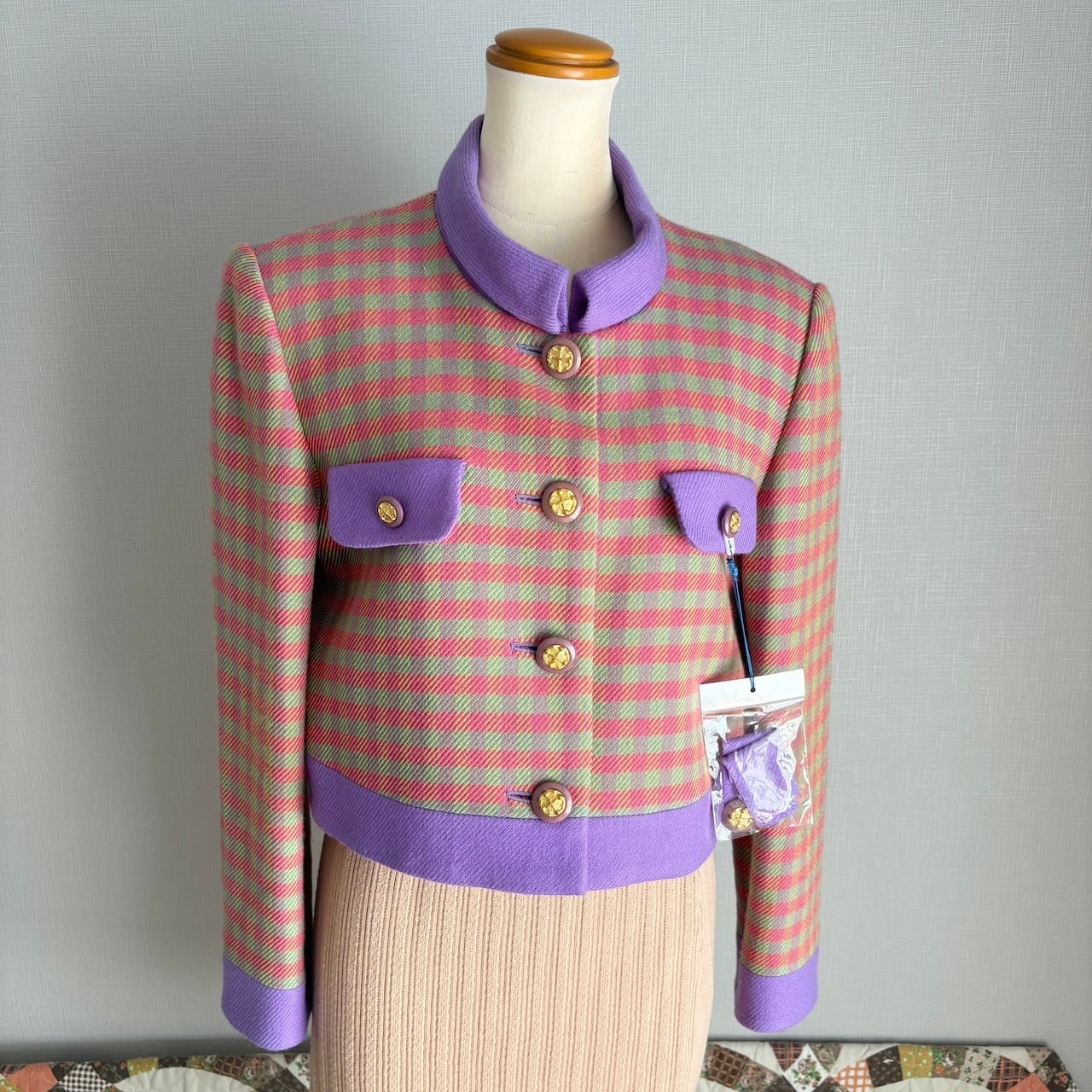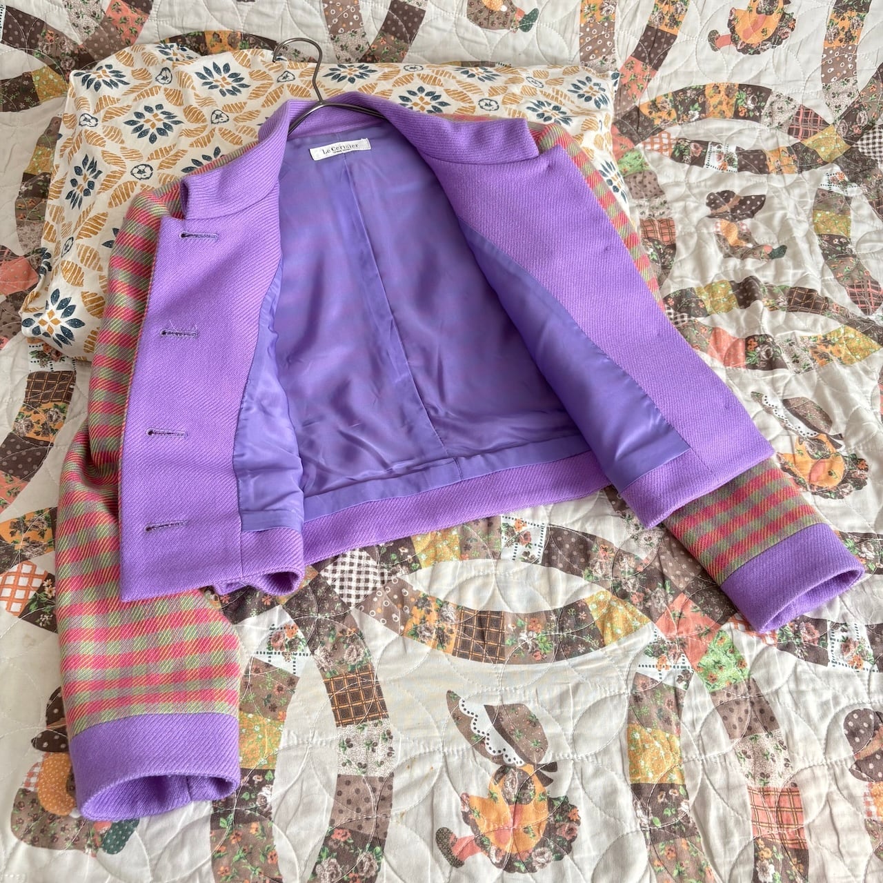 80s ショート丈ウールジャケット パープル×ギンガムチェック 昭和レトロヴィンテージ古着