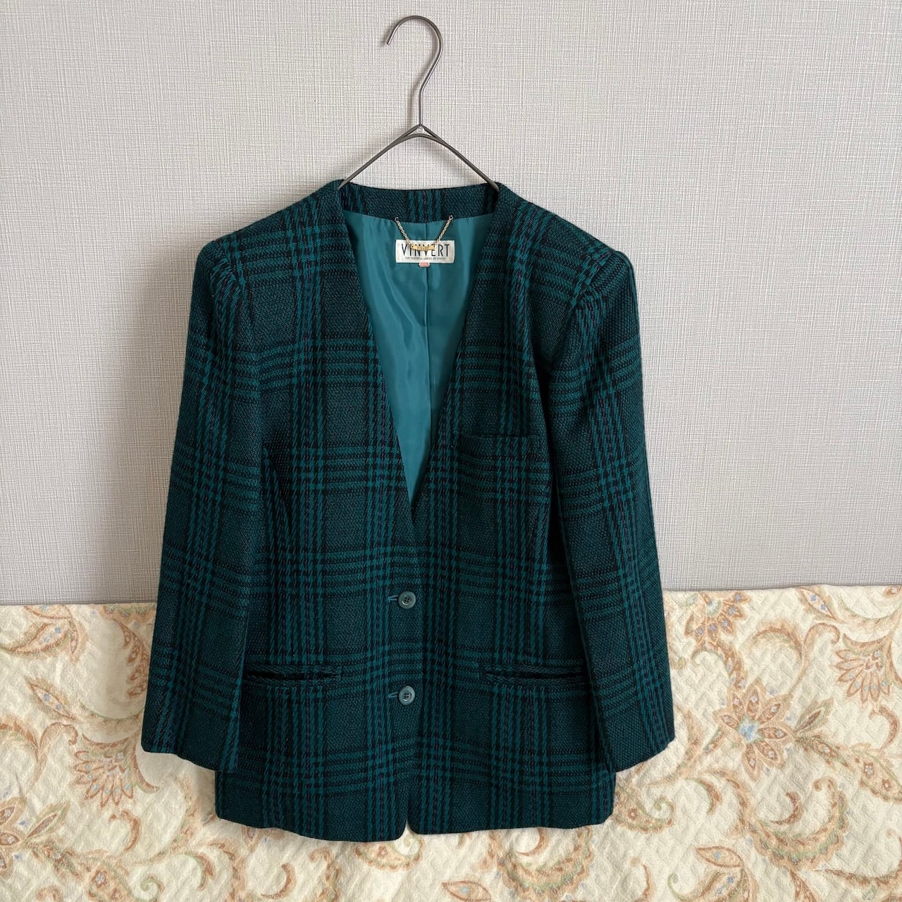 80s 深緑 ツイード ウール 襟なしジャケット 昭和レトロヴィンテージ古着