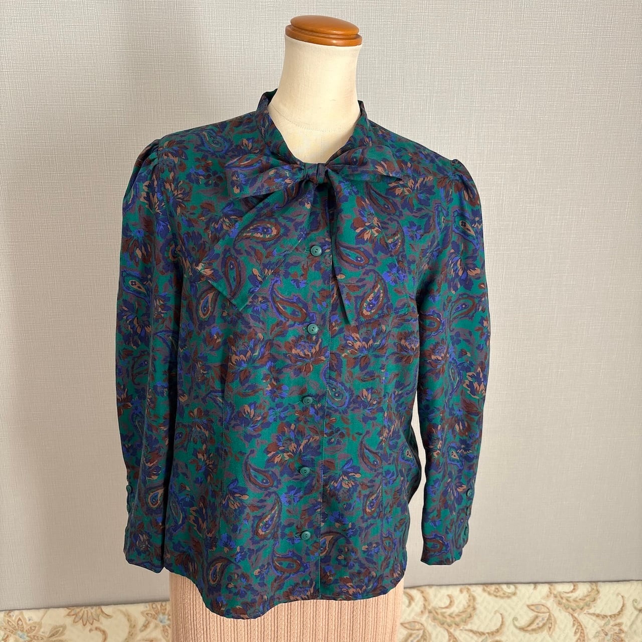 80s タイ付きブラウス グリーン ペイズリー 昭和レトロヴィンテージ古着