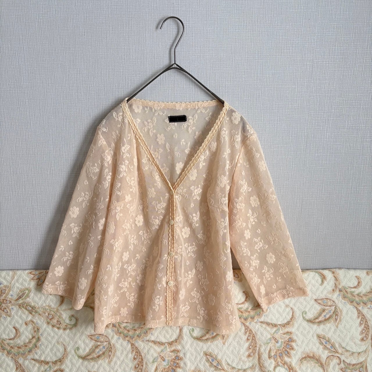 90s クリームイエロー 総レース カーディガン レトロヴィンテージ古着