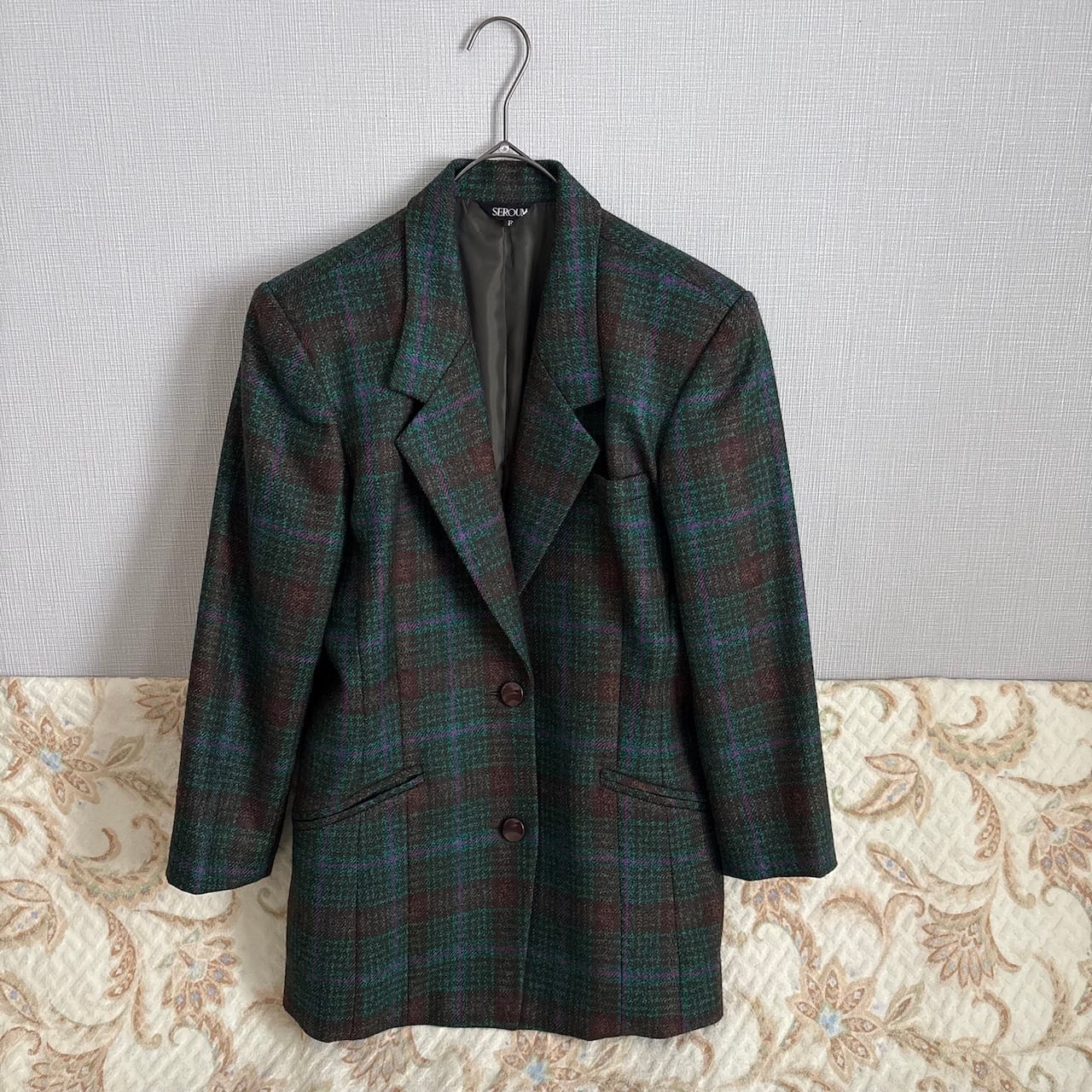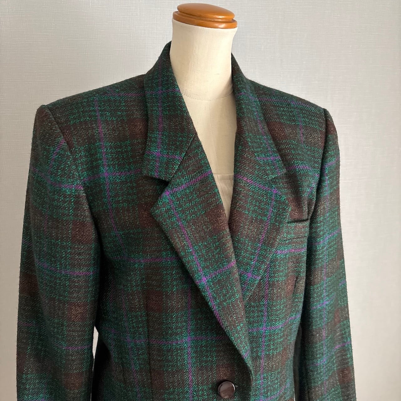 80s ウール テーラードジャケット みどりタータンチェック 昭和レトロヴィンテージ古着