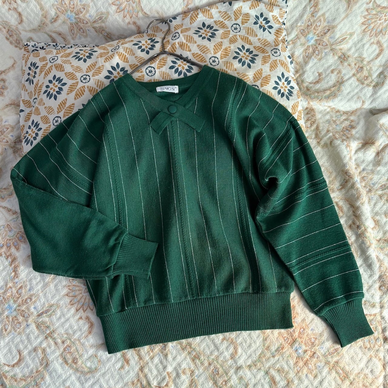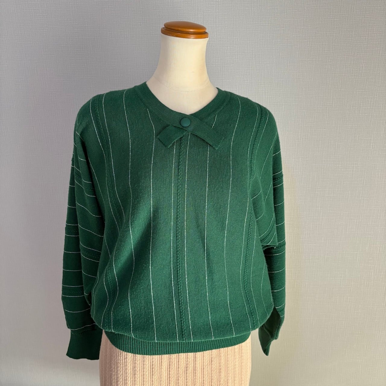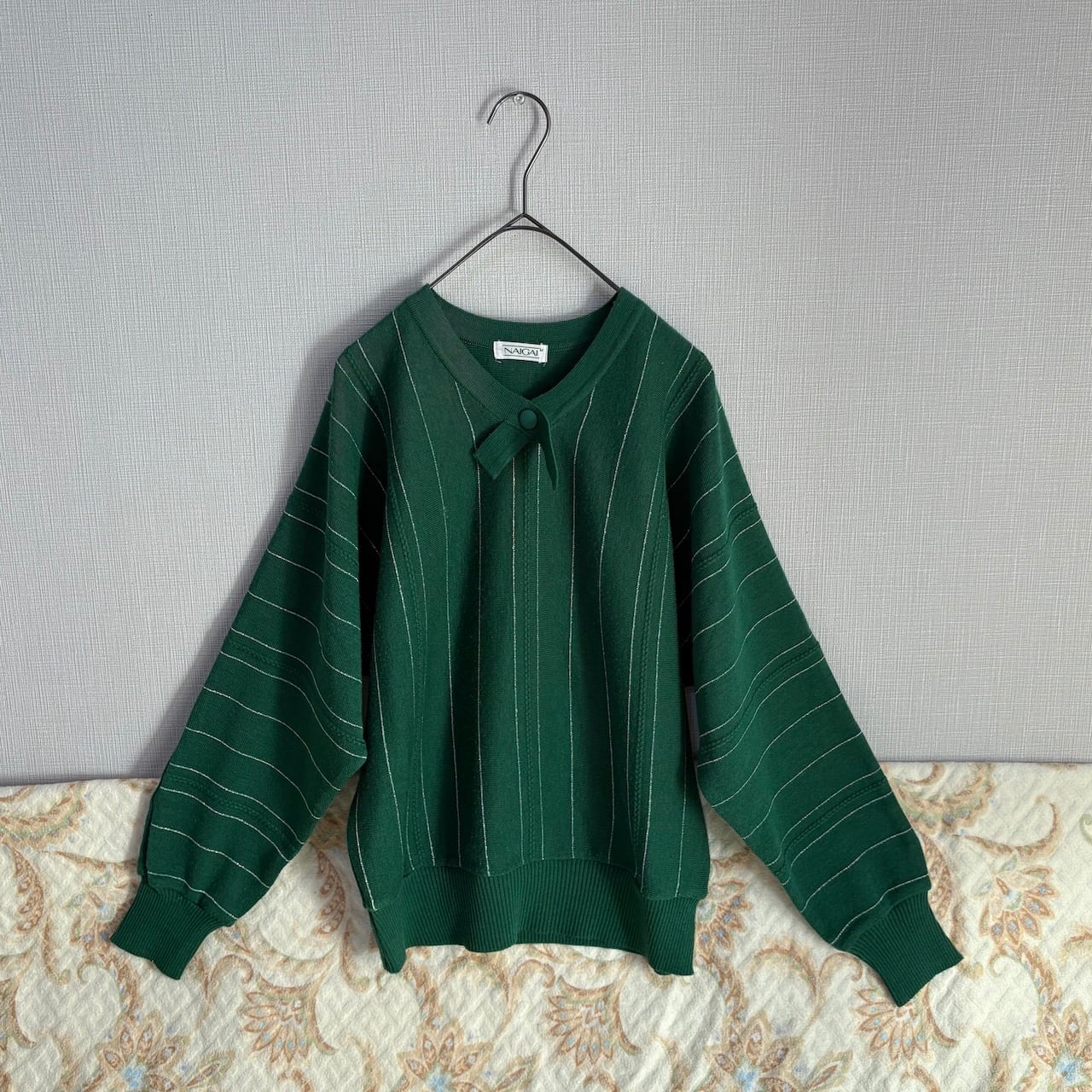 70s NAIGAI ラメ糸ストライプ タイ付き 緑ニットセーター 昭和レトロヴィンテージ古着