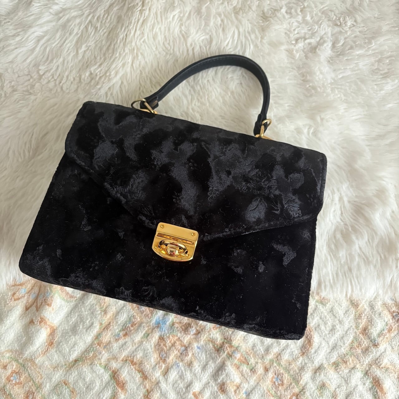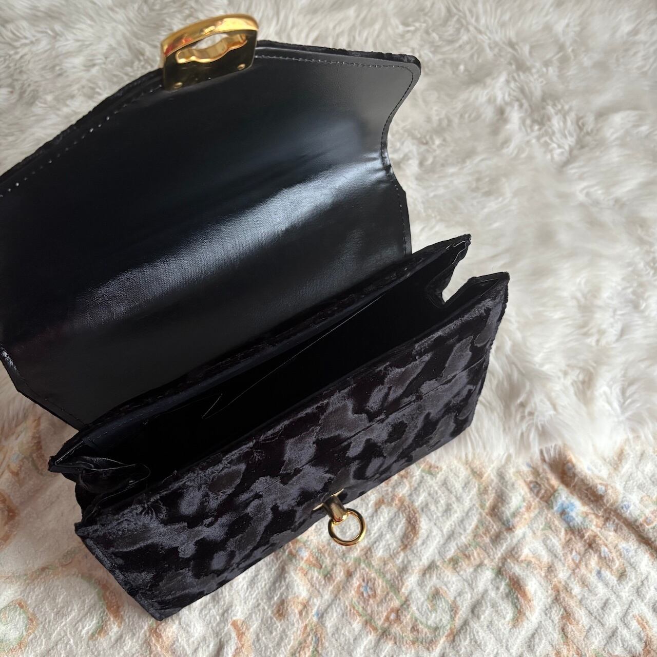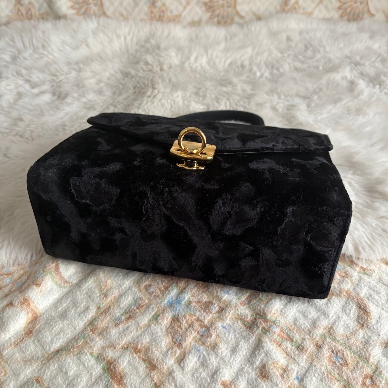 70s ベルベット 黒 ハンドバッグ 肩紐付き 昭和レトロヴィンテージ古着