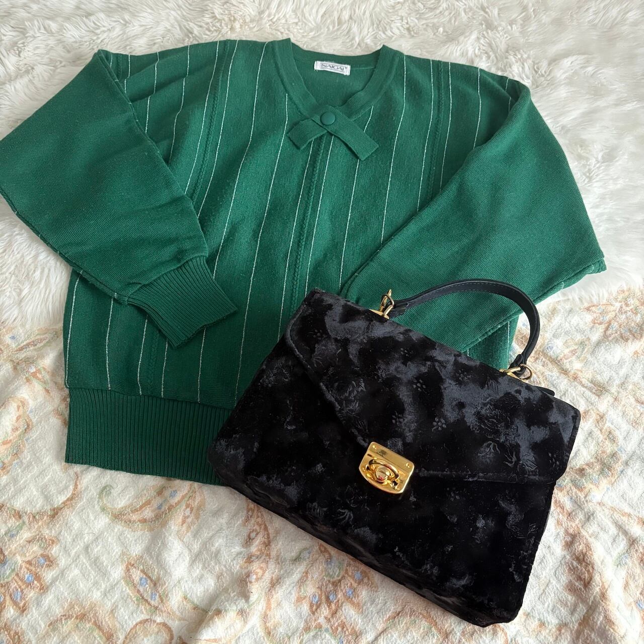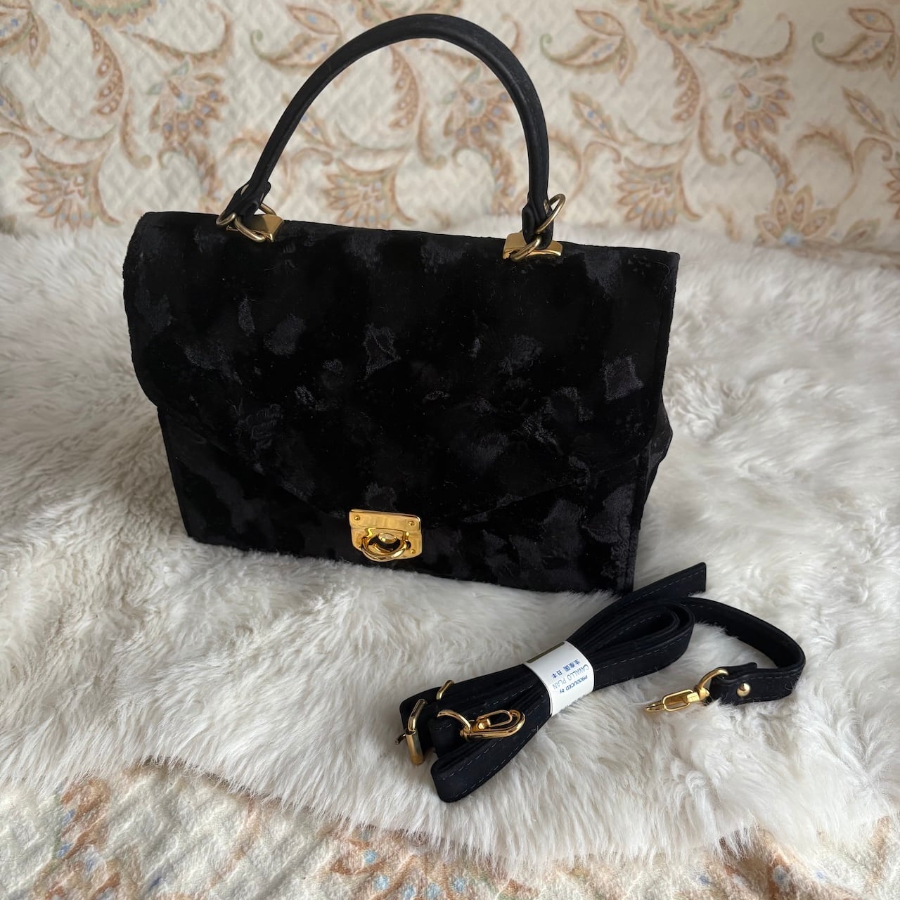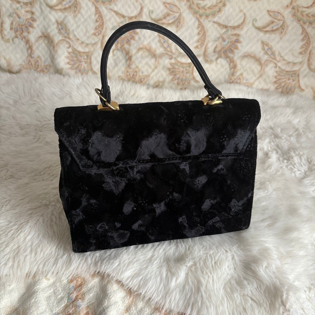 70s ベルベット 黒 ハンドバッグ 肩紐付き 昭和レトロヴィンテージ古着