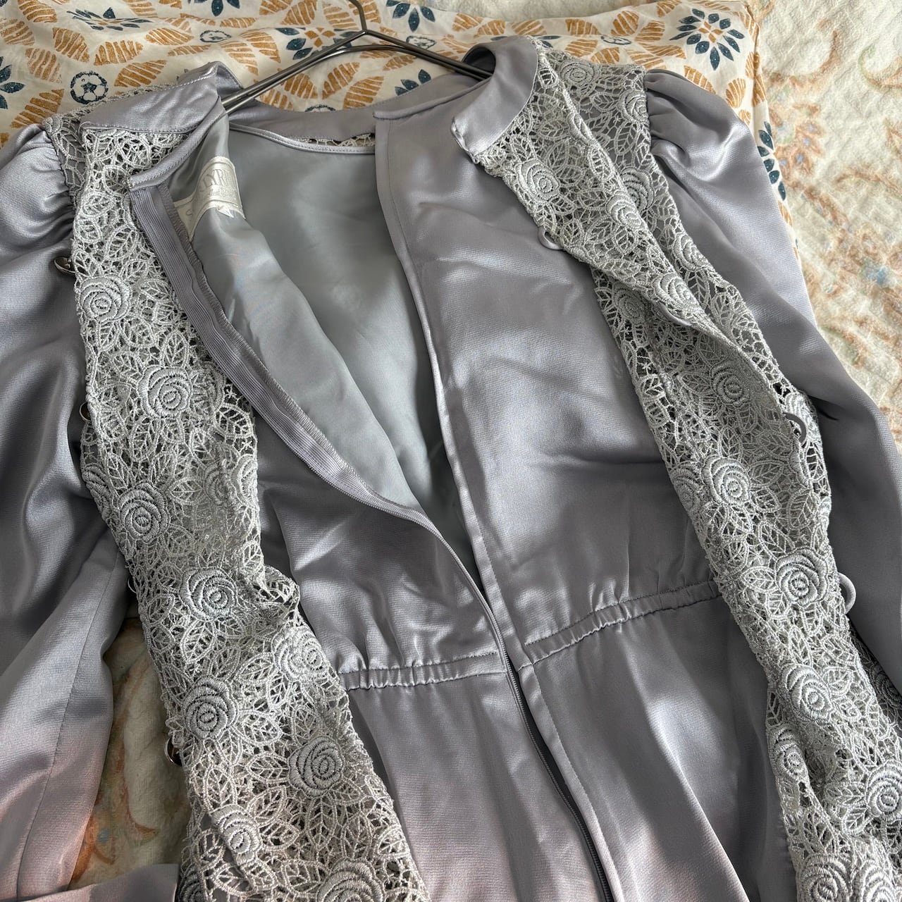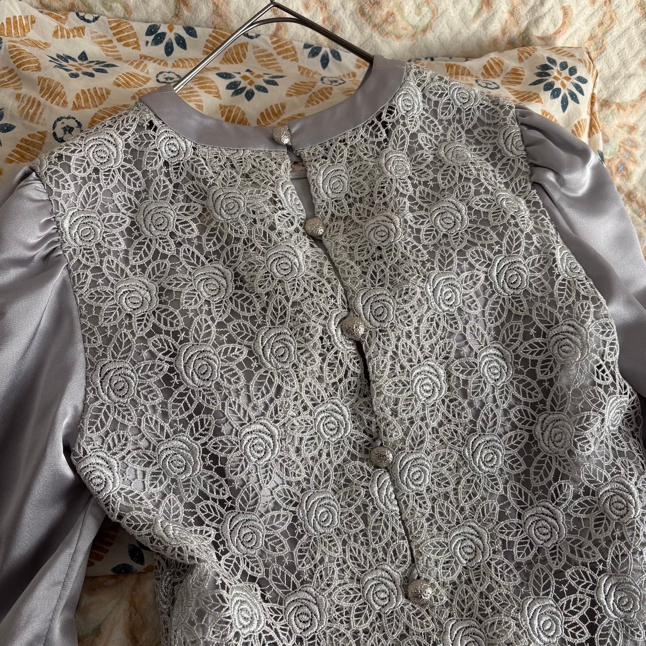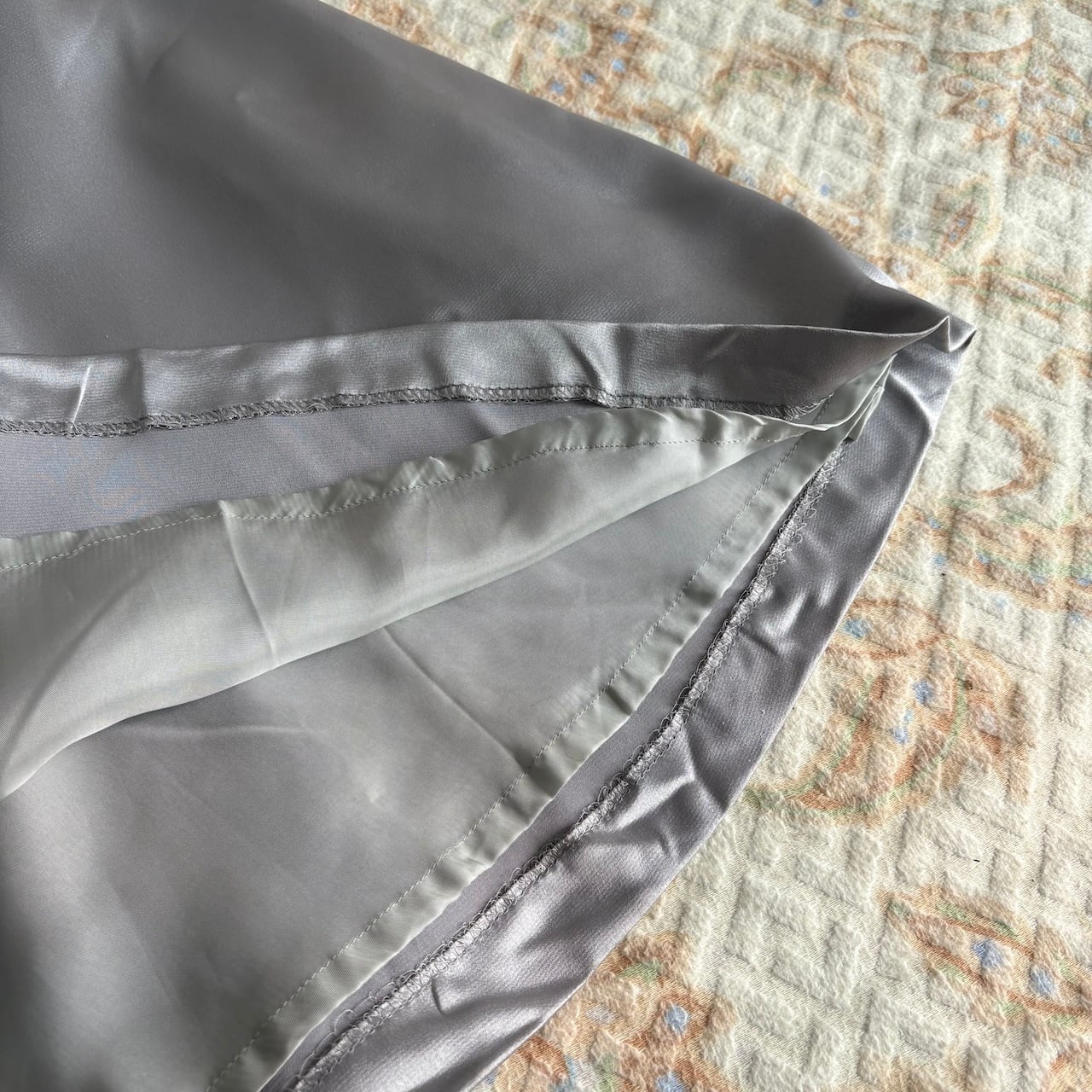 光沢のあるグレーの生地で作られた