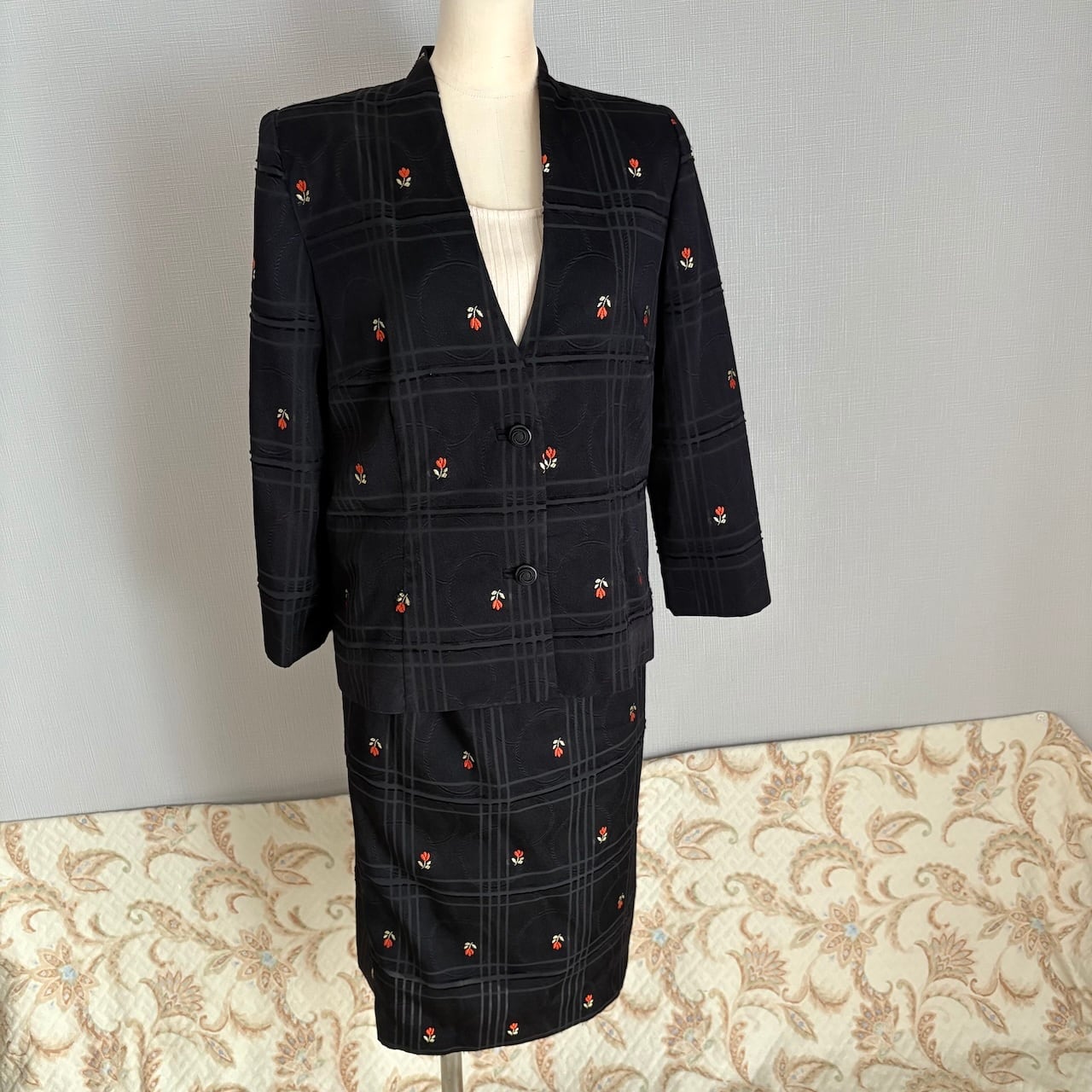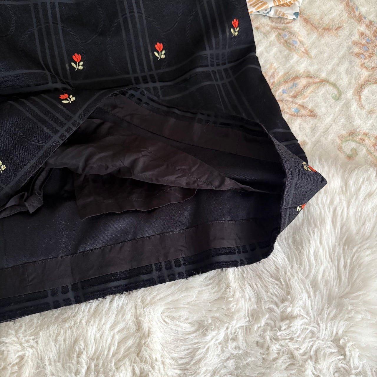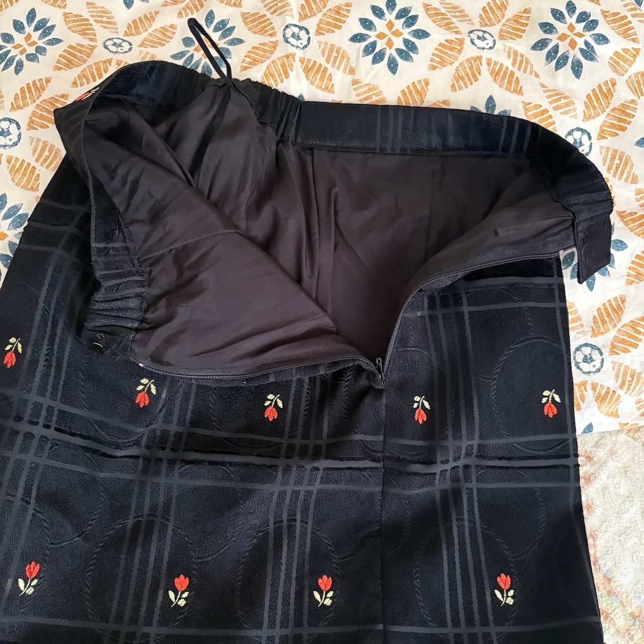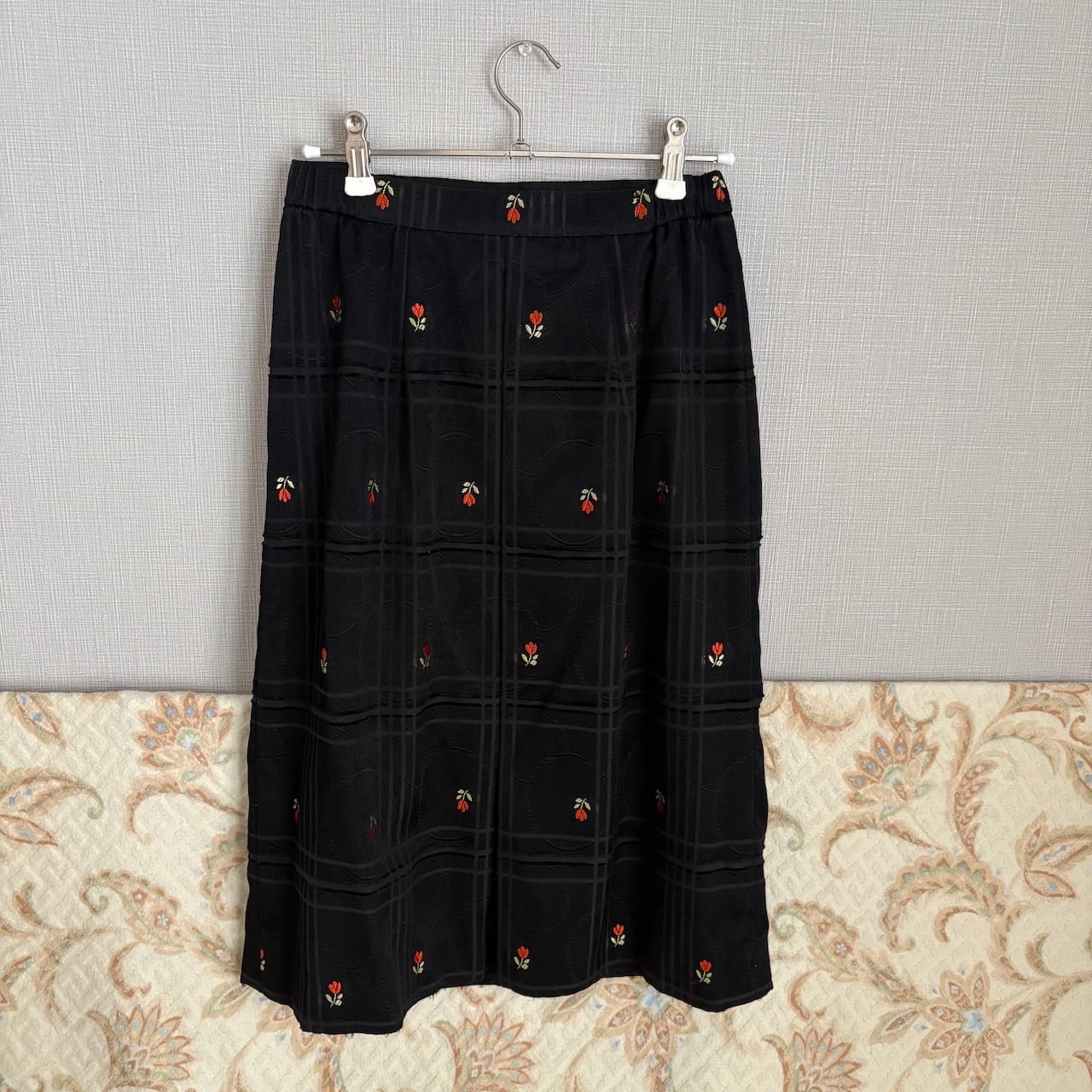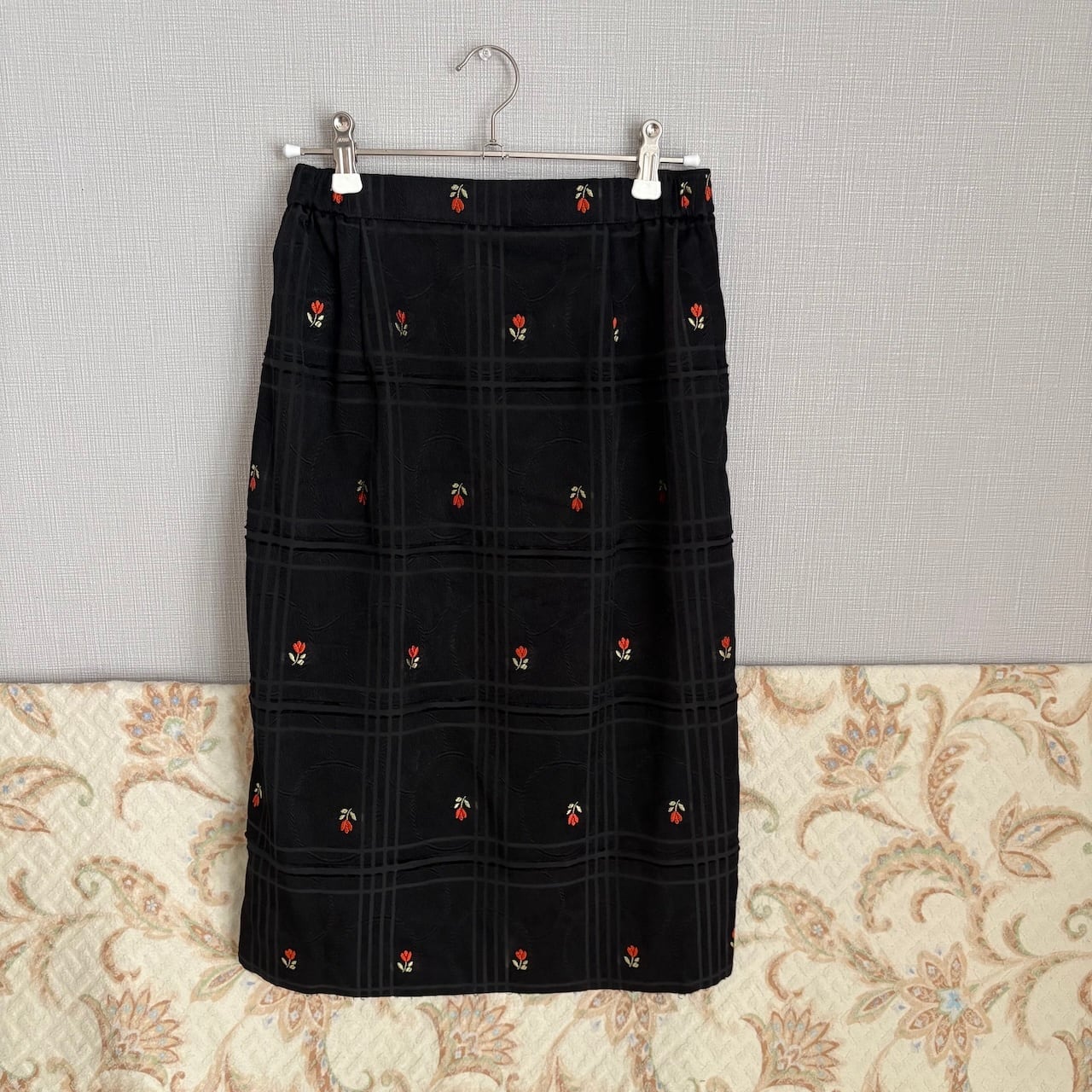 70s チューリップ刺繍 黒 台形スカート 昭和レトロヴィンテージ古着