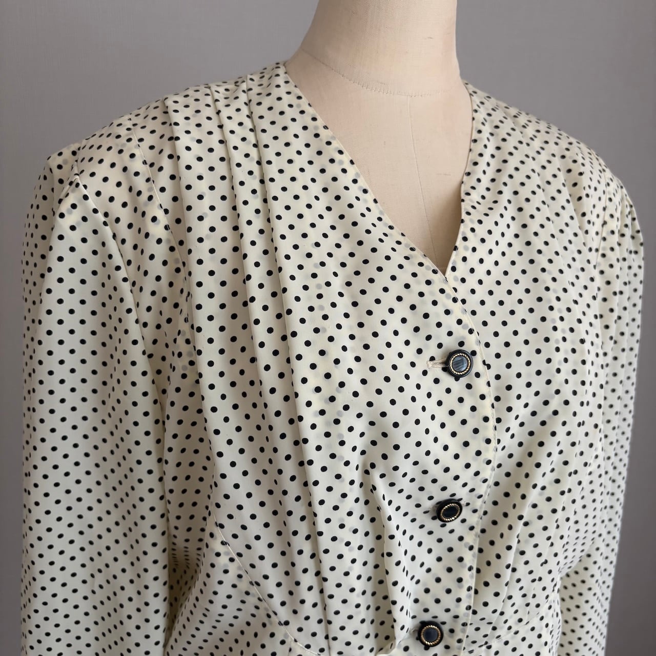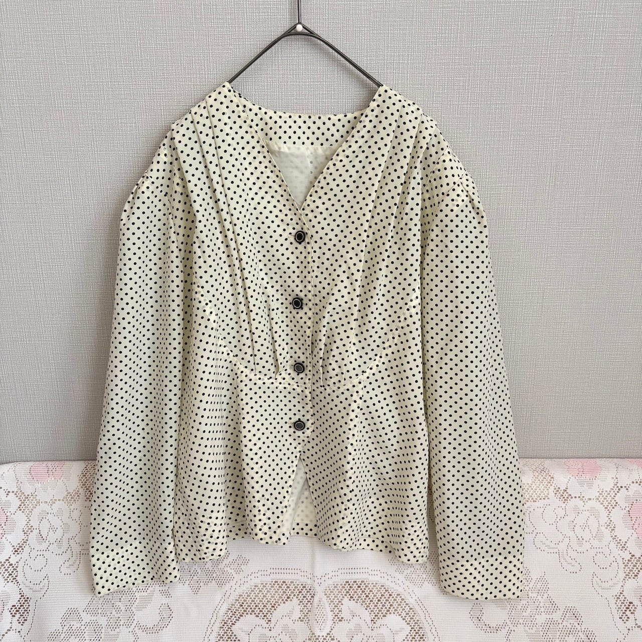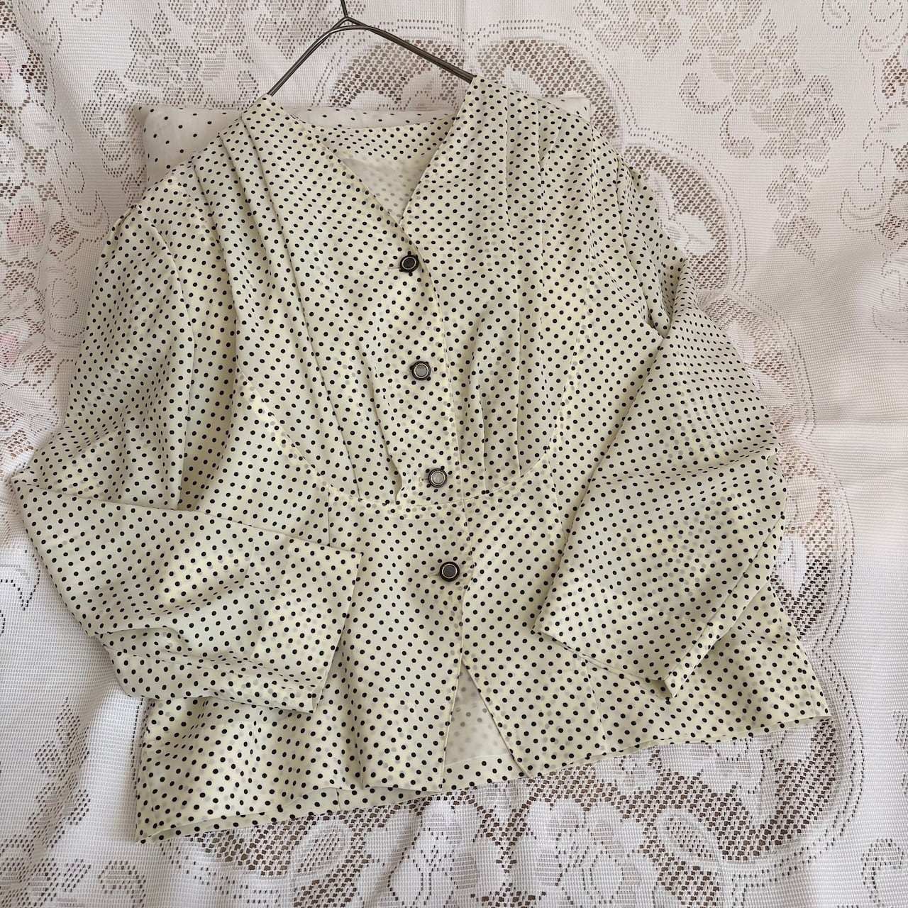 70s 白黒ドット柄 襟なしブラウス 昭和レトロヴィンテージ古着