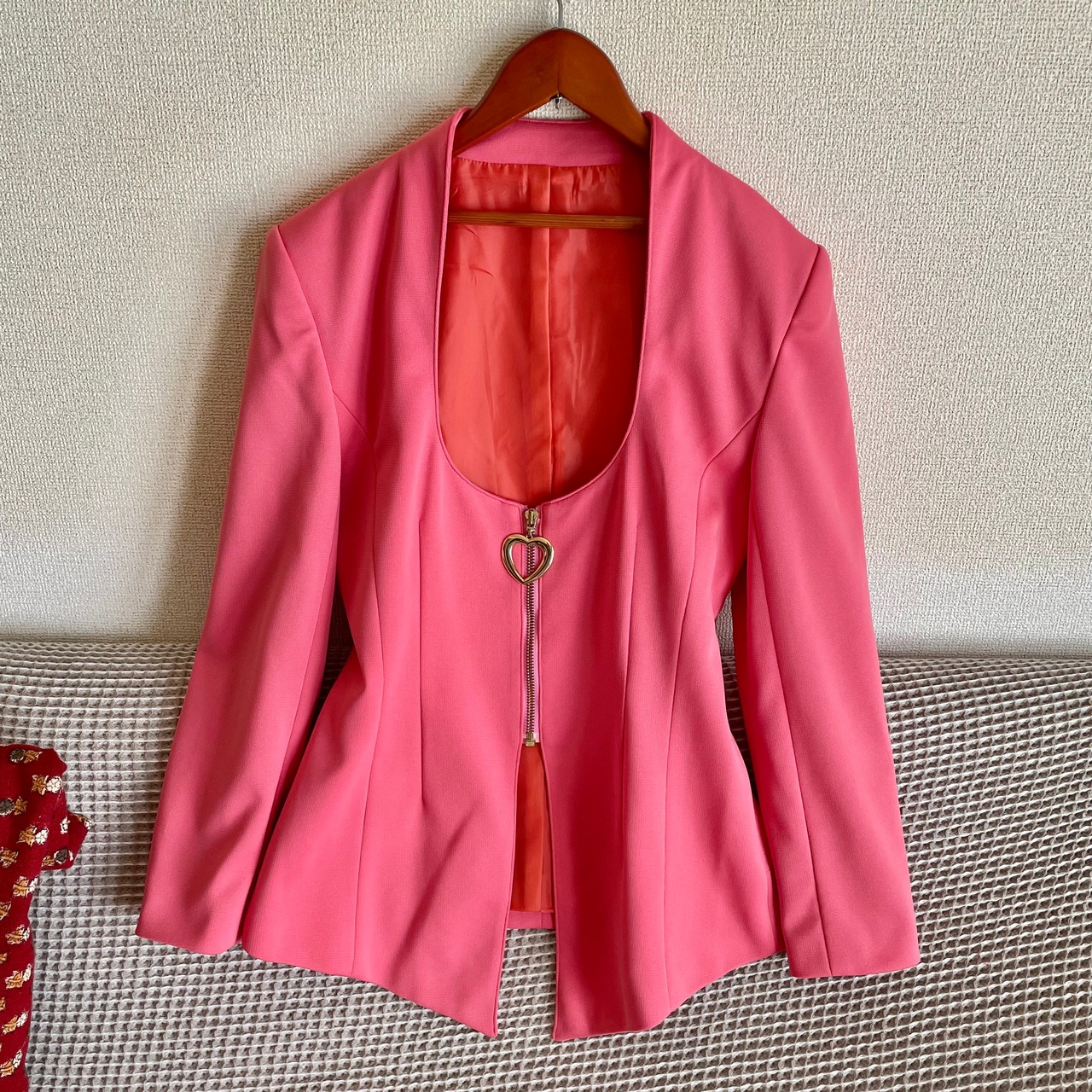 80s サーモンピンク ノーカラー ハート付ジャケット レトロヴィンテージ古着