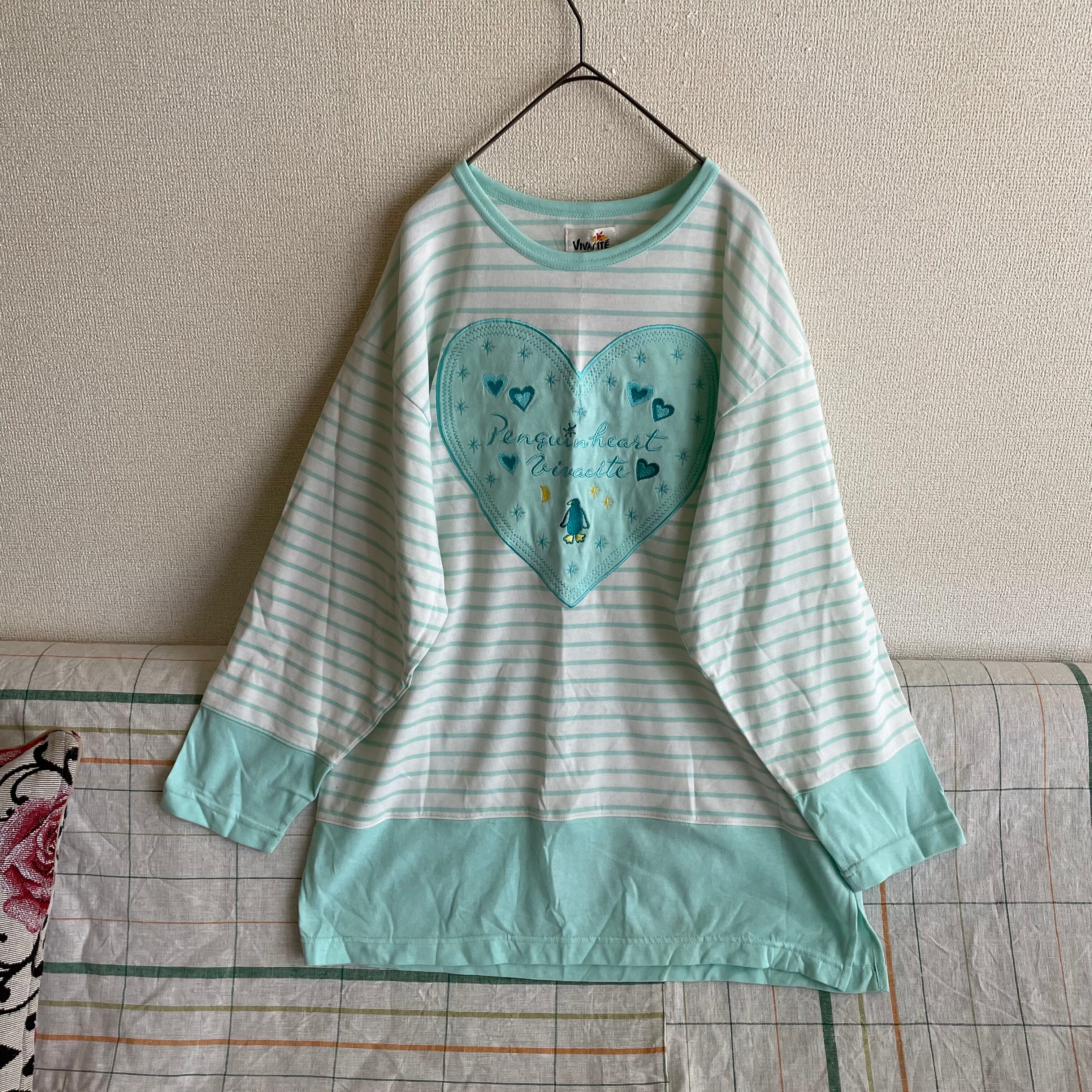 80s ボーダー×刺繍 切り替えトップス/カットソー/デッドストック