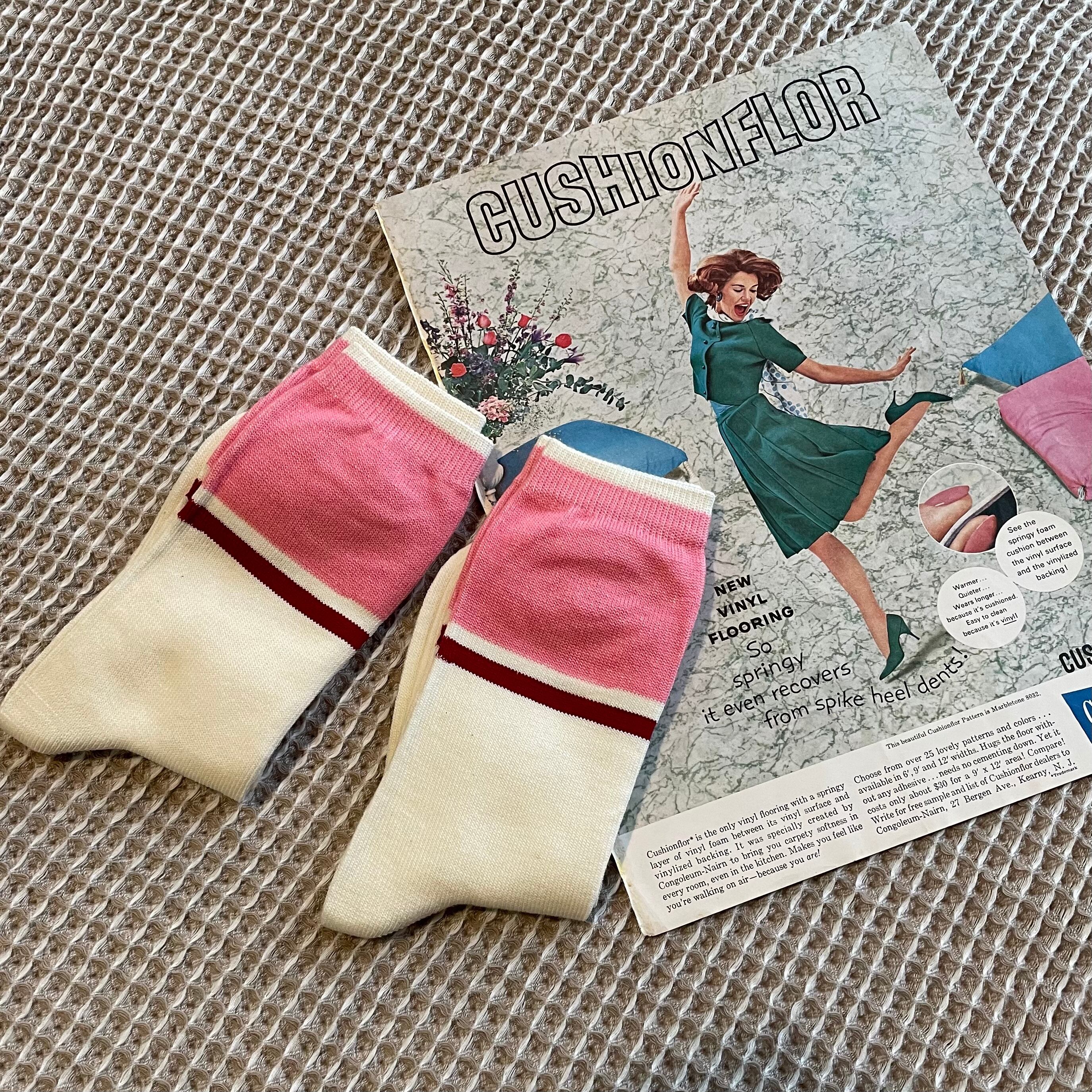 デッドストック/70sクリーム×ピンク.赤.靴下.ソックス 23~24.5cm