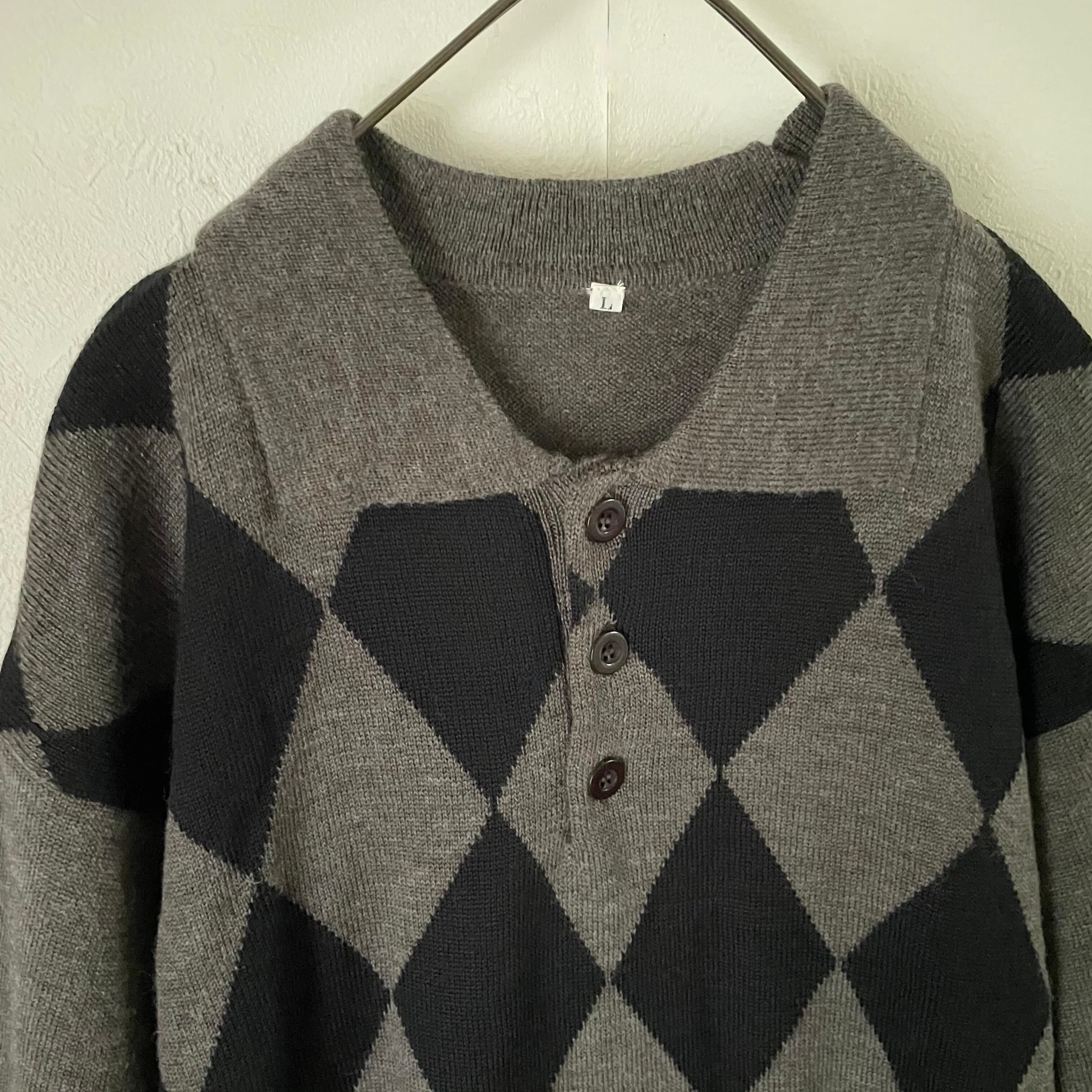 70s Lサイズ 襟付きニット ダイヤ柄 昭和レトロヴィンテージ古着