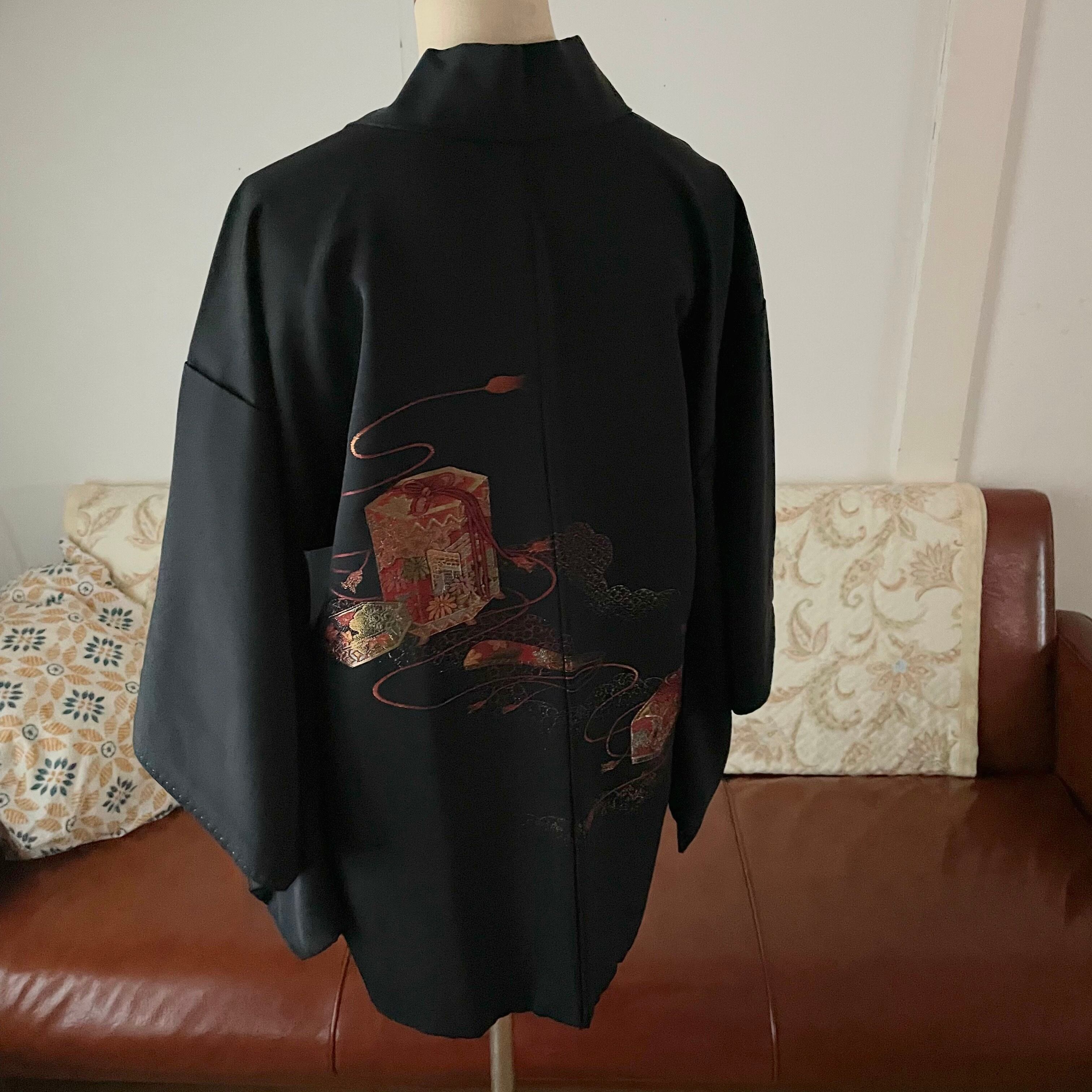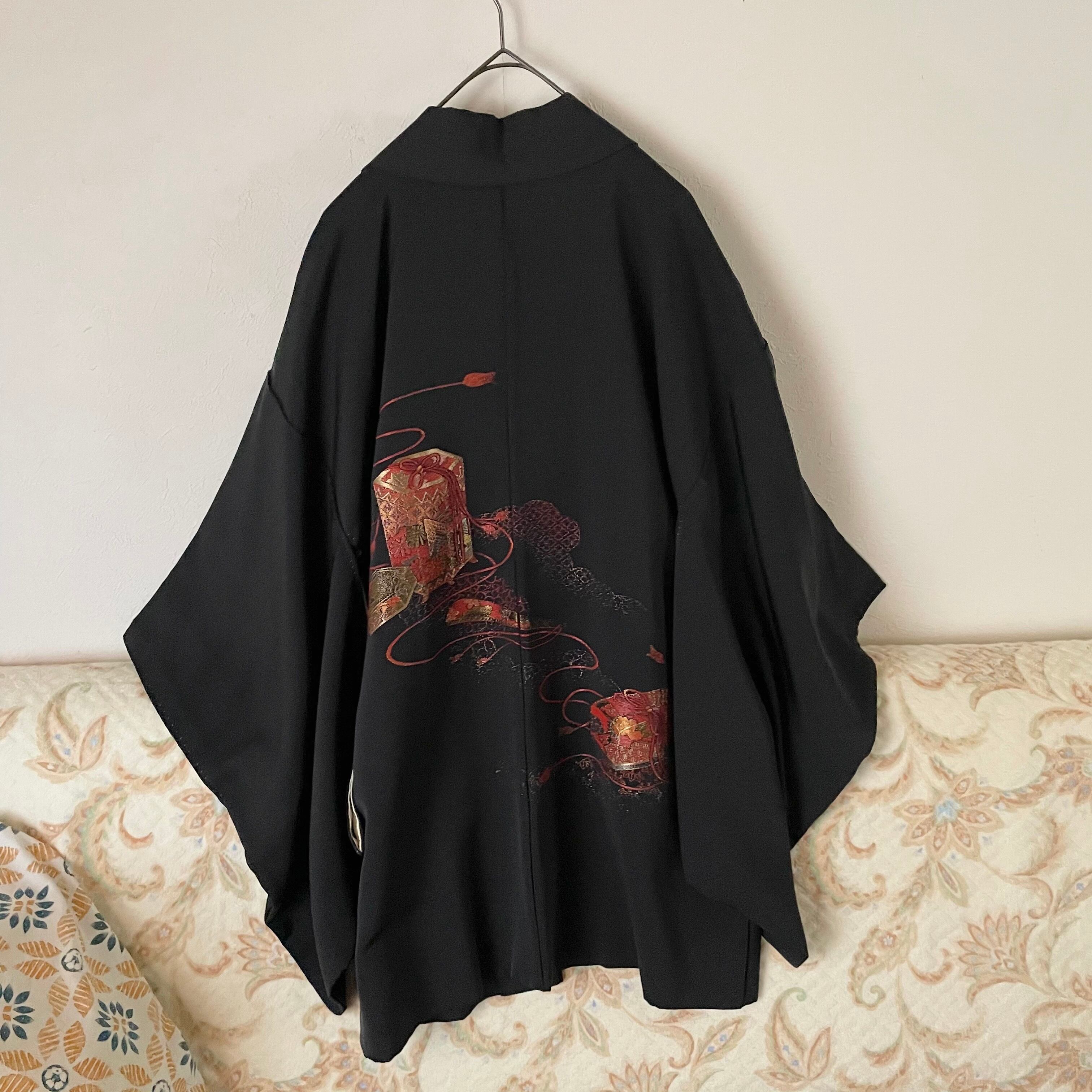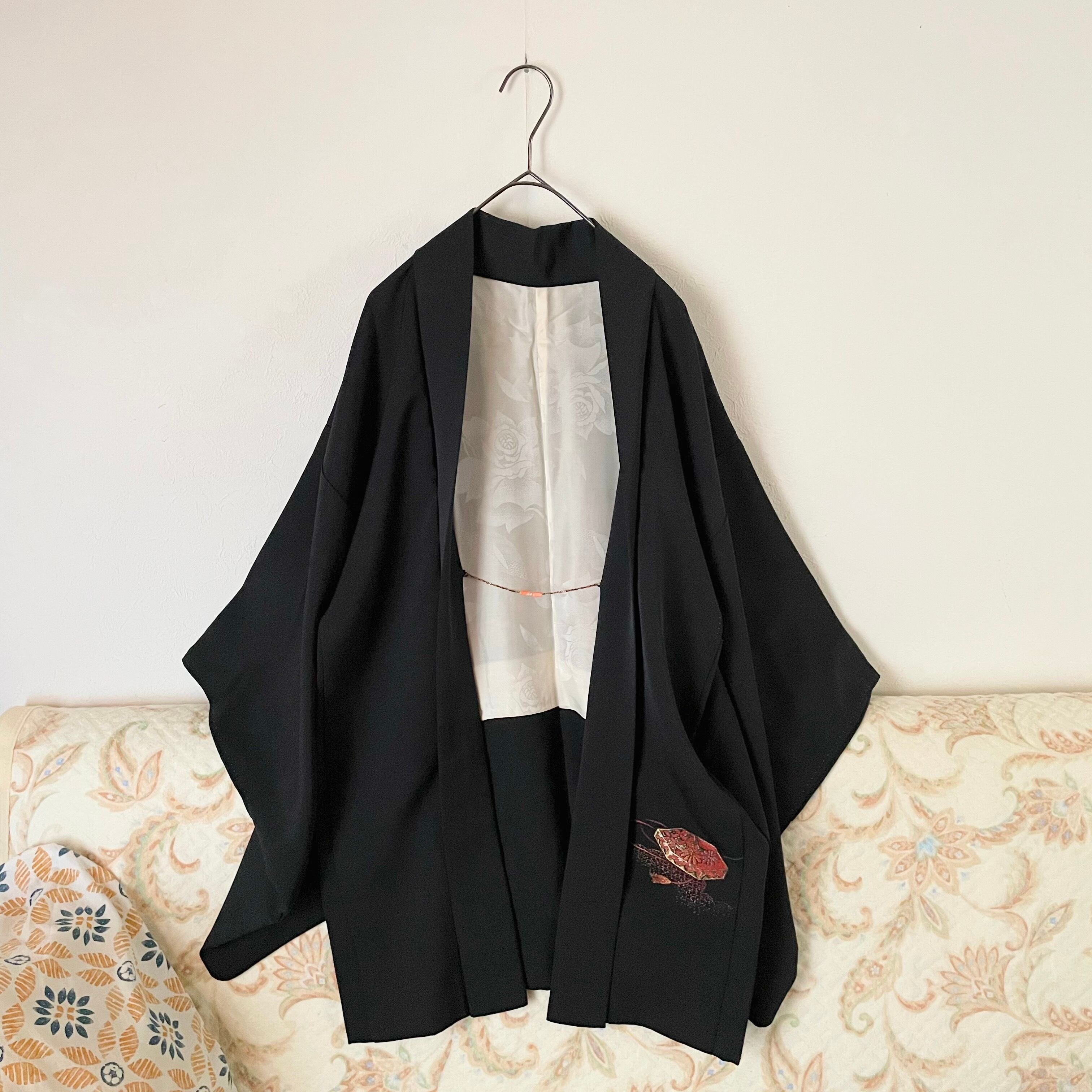 羽織着物 黒 ビーズ紐 昭和レトロヴィンテージ着物
