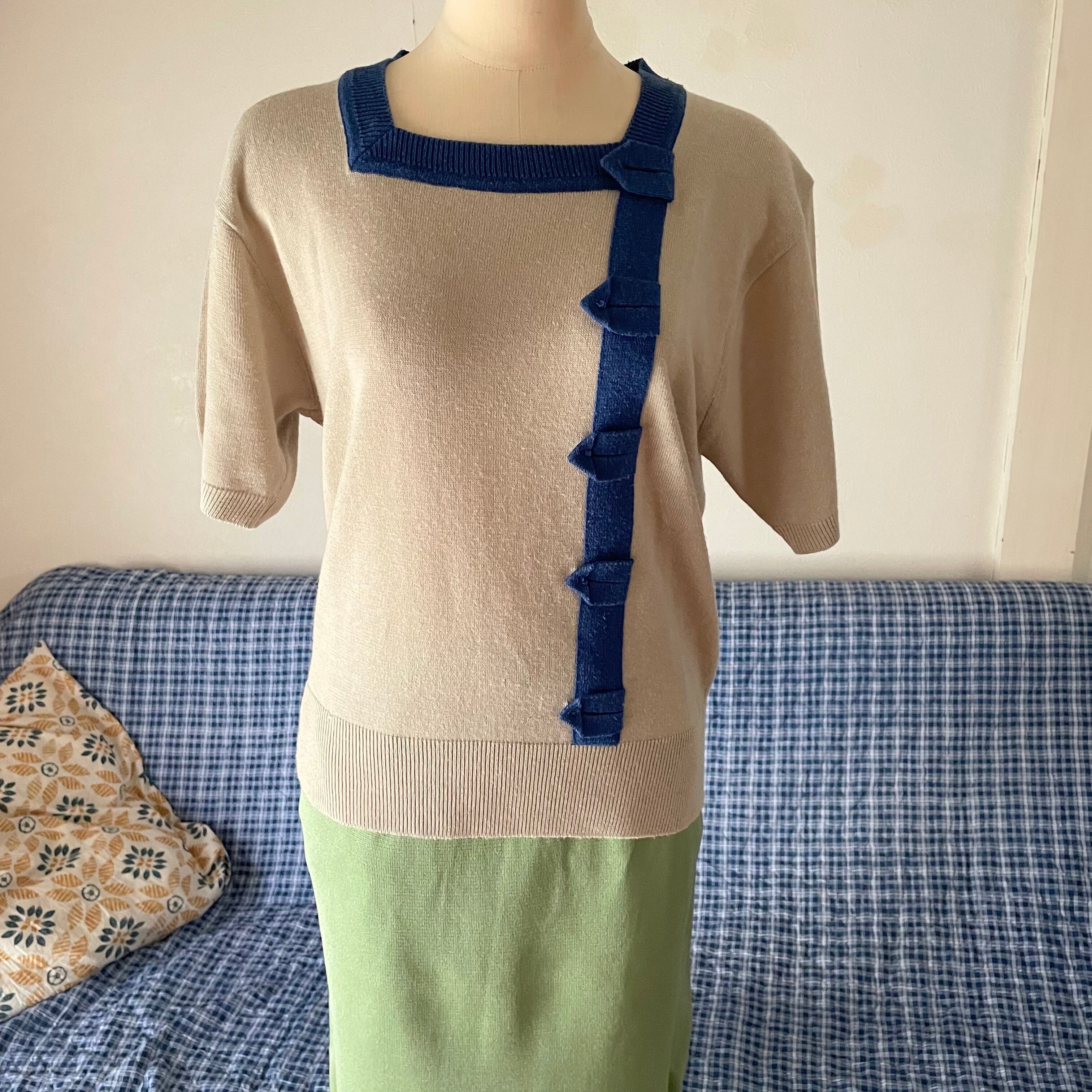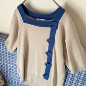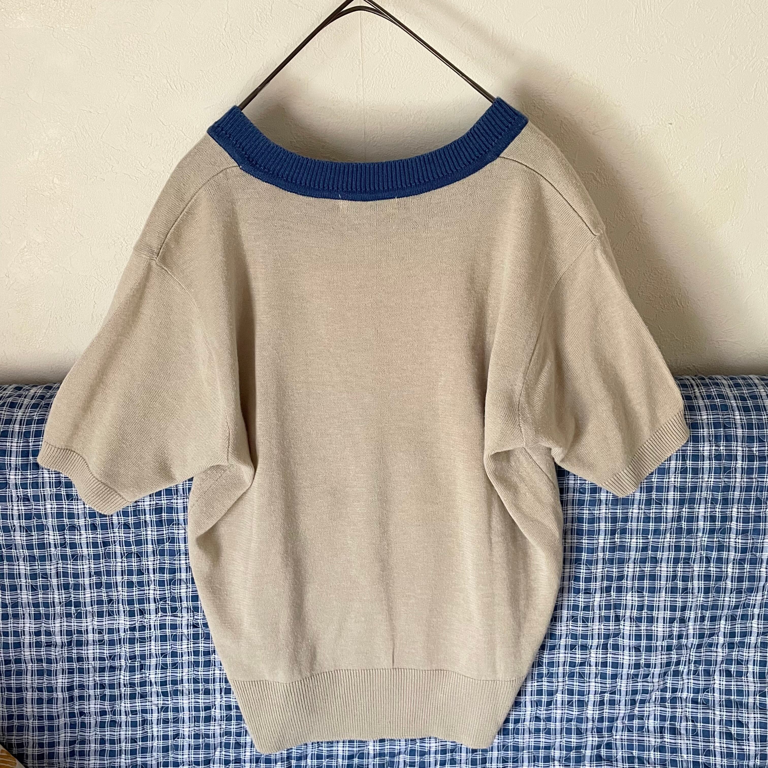 80s リネン混 半袖サマーニット グレー ブルーライン 昭和レトロヴィンテージ古着