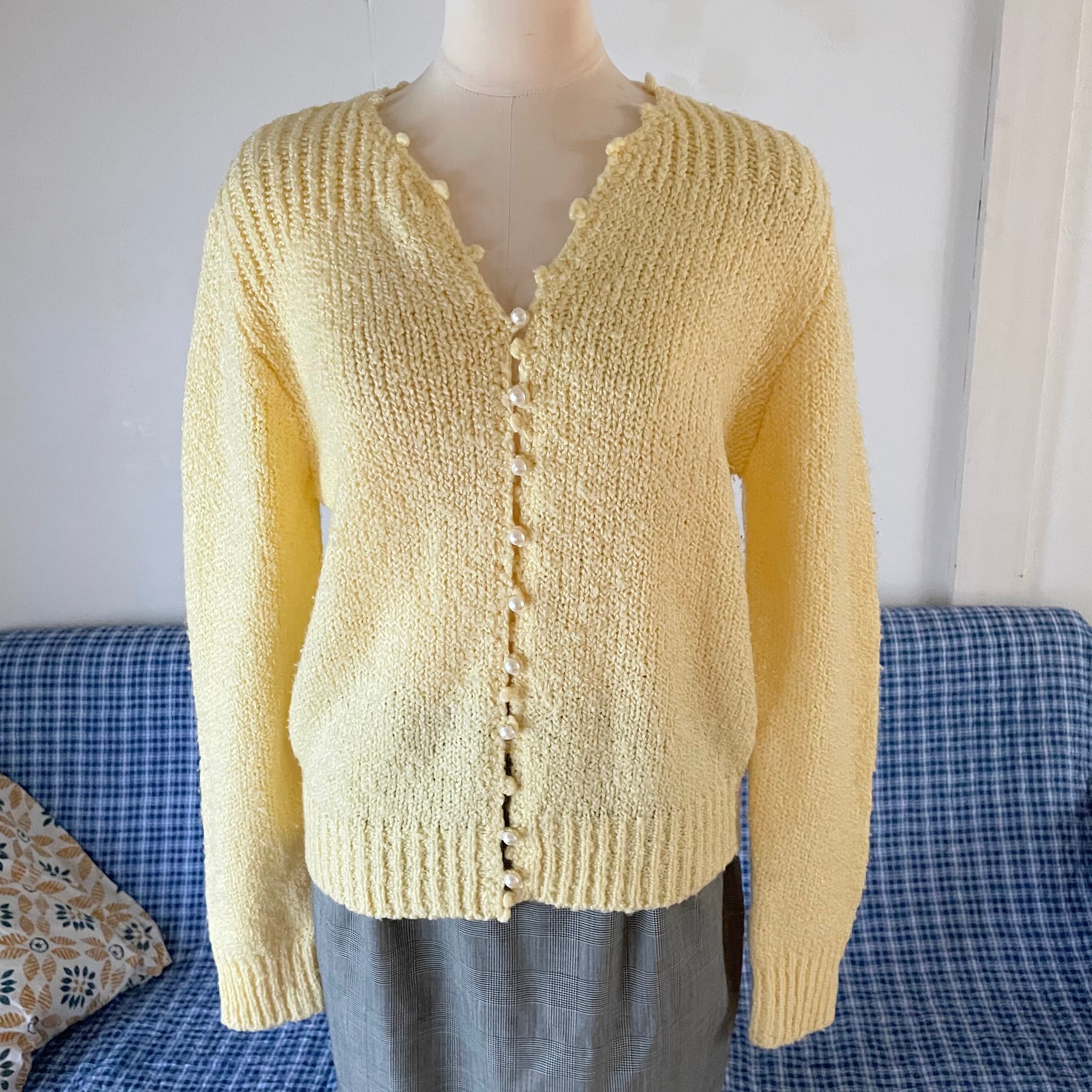 80s アクリルサマーニットカーディガン 淡黄色 レトロヴィンテージ古着