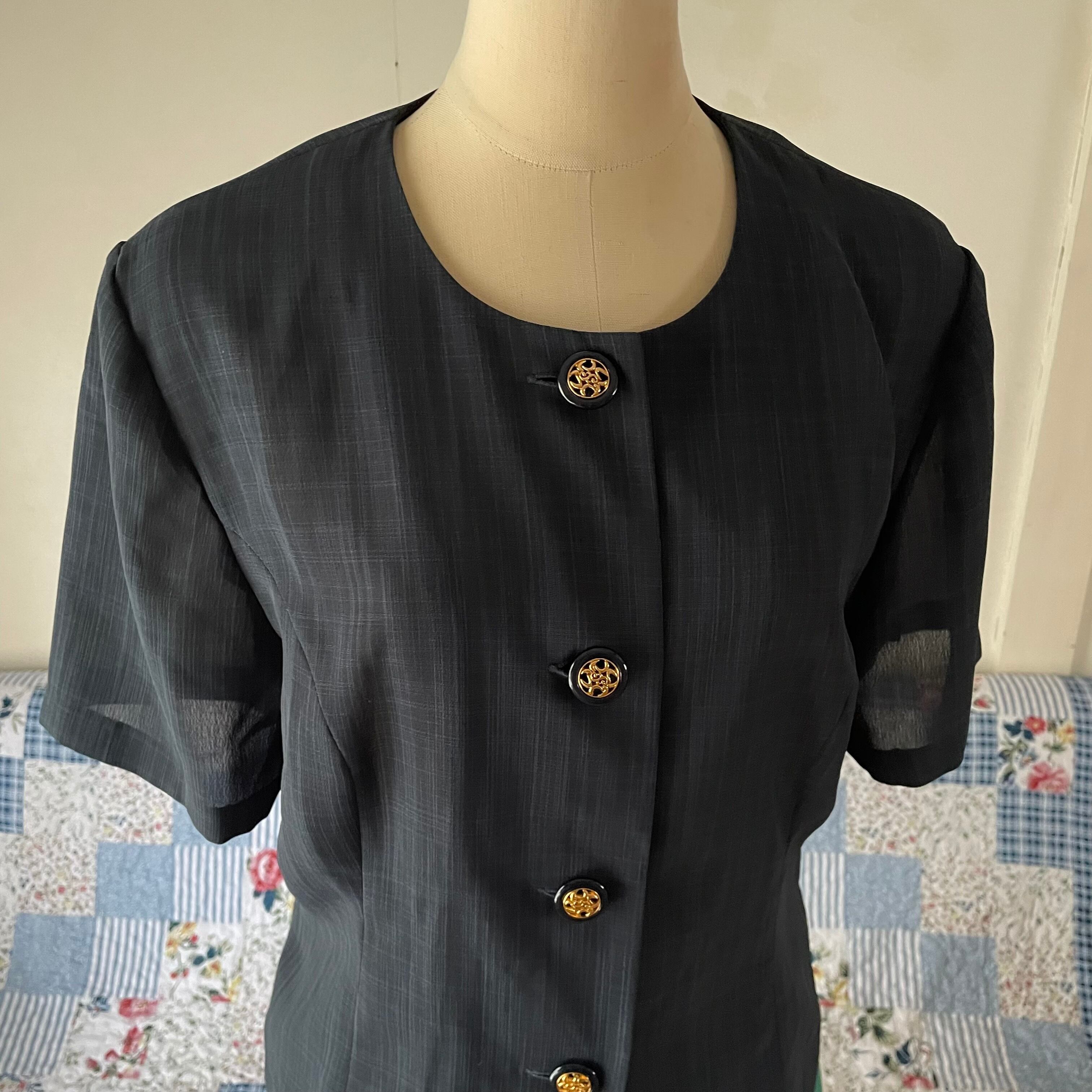 70s ネイビー 半袖薄手ブラウス 昭和レトロヴィンテージ古着