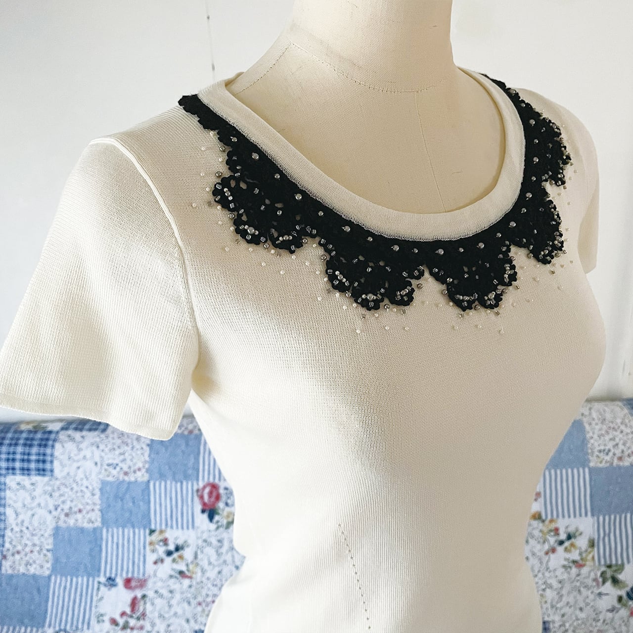 襟は黒いクロシェレースとビーズ刺繍