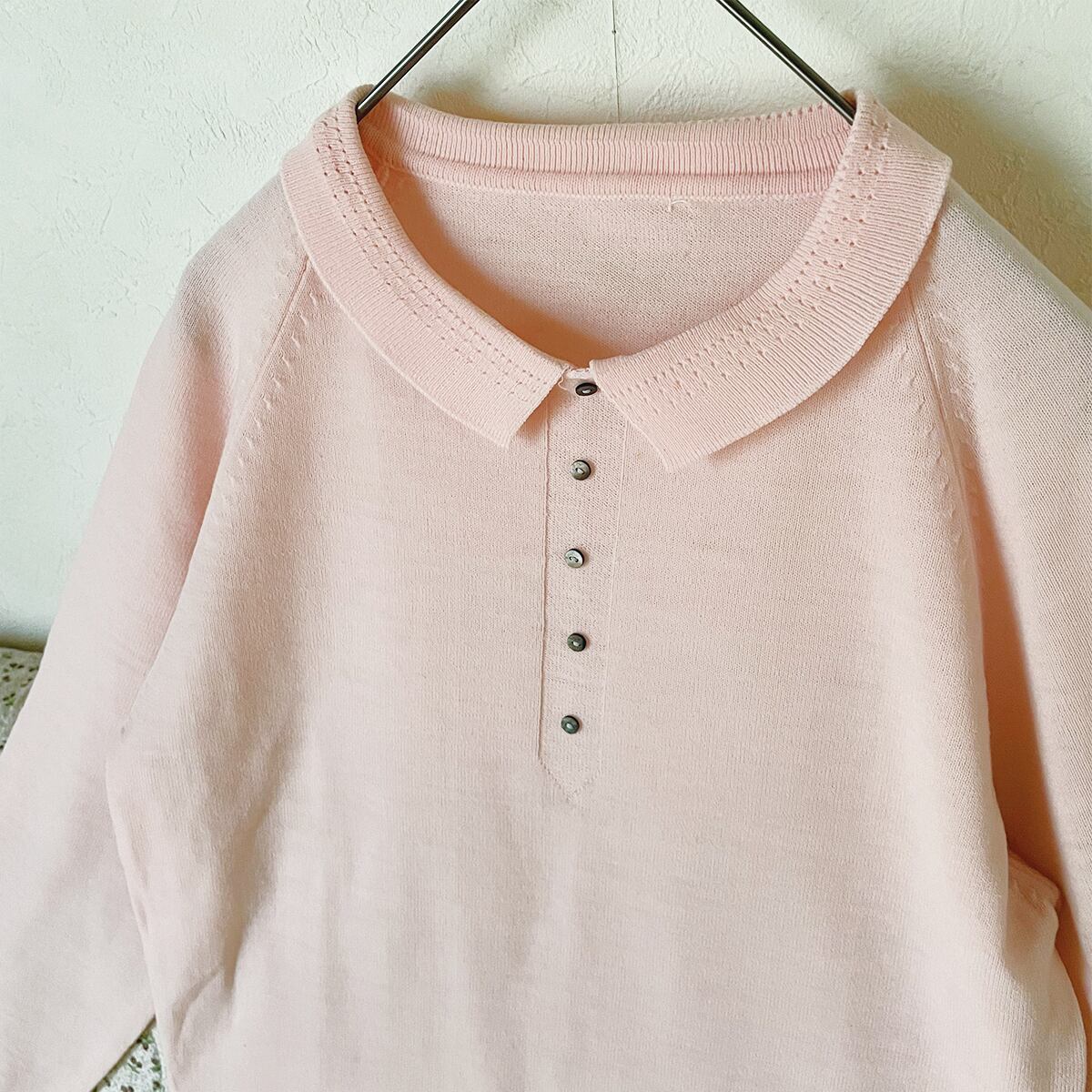 70s ベビーピンク 襟付きニットトップス 昭和レトロ ヴィンテージ古着