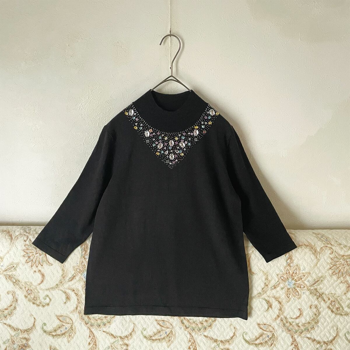 80s ビジュー ブラック ウール七分丈袖 セーター 昭和レトロ ヴィンテージ古着