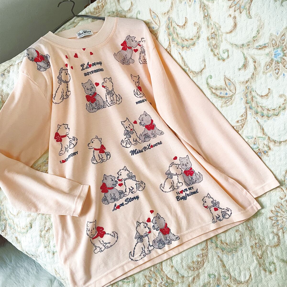 80s 犬イラスト ベビーピンク 長袖カットソー昭和レトロヴィンテージ古着