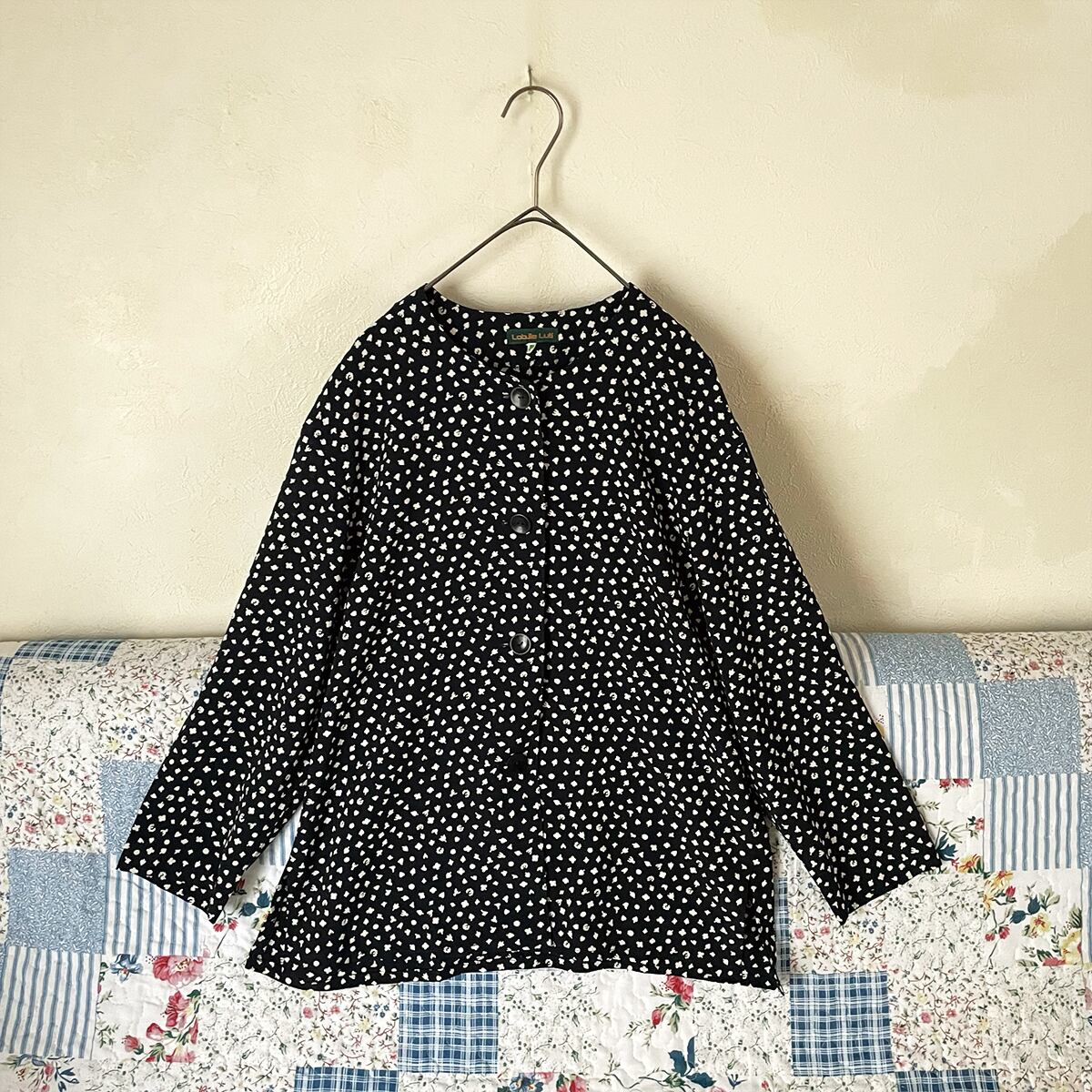 80s 総柄 長袖 襟なしシャツ 昭和レトロヴィンテージ古着