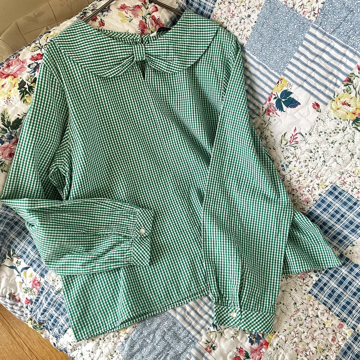 USED ミントグリーン ギンガムチェック ブラウス 古着