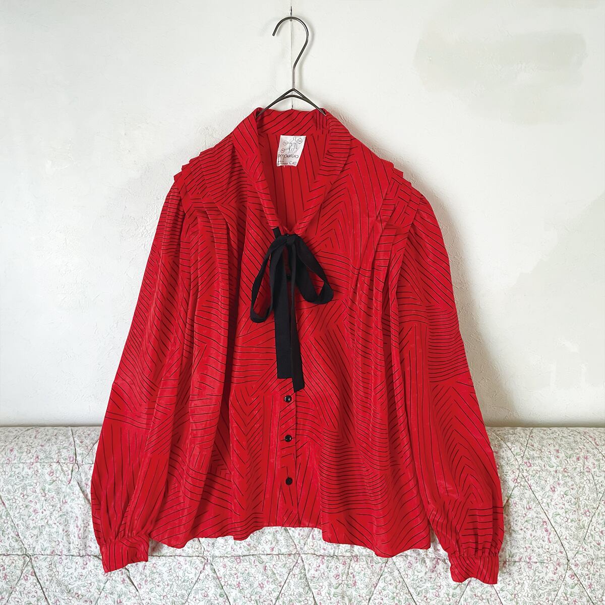 80s ボウタイ タックシャツ 赤×黒 昭和レトロヴィンテージ古着