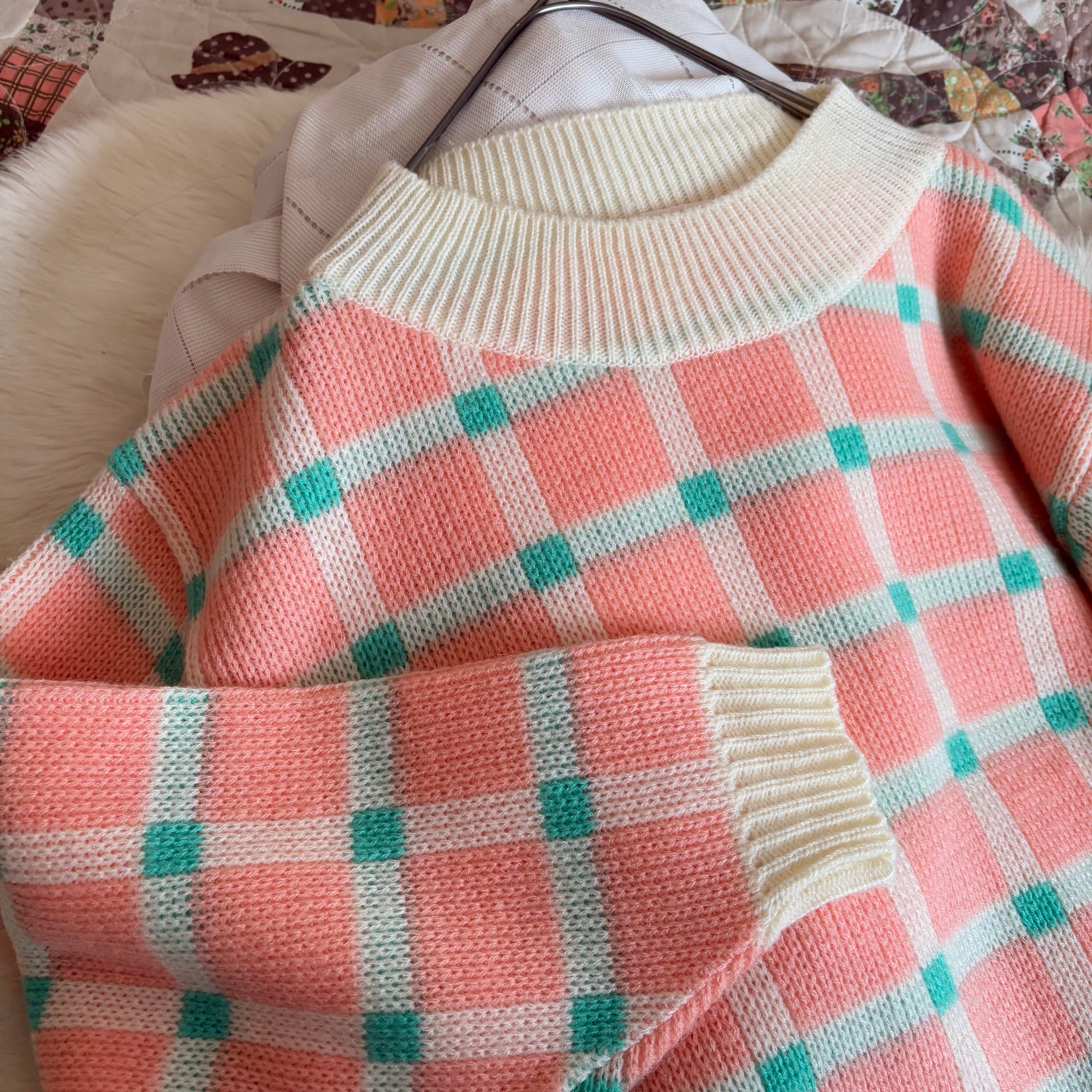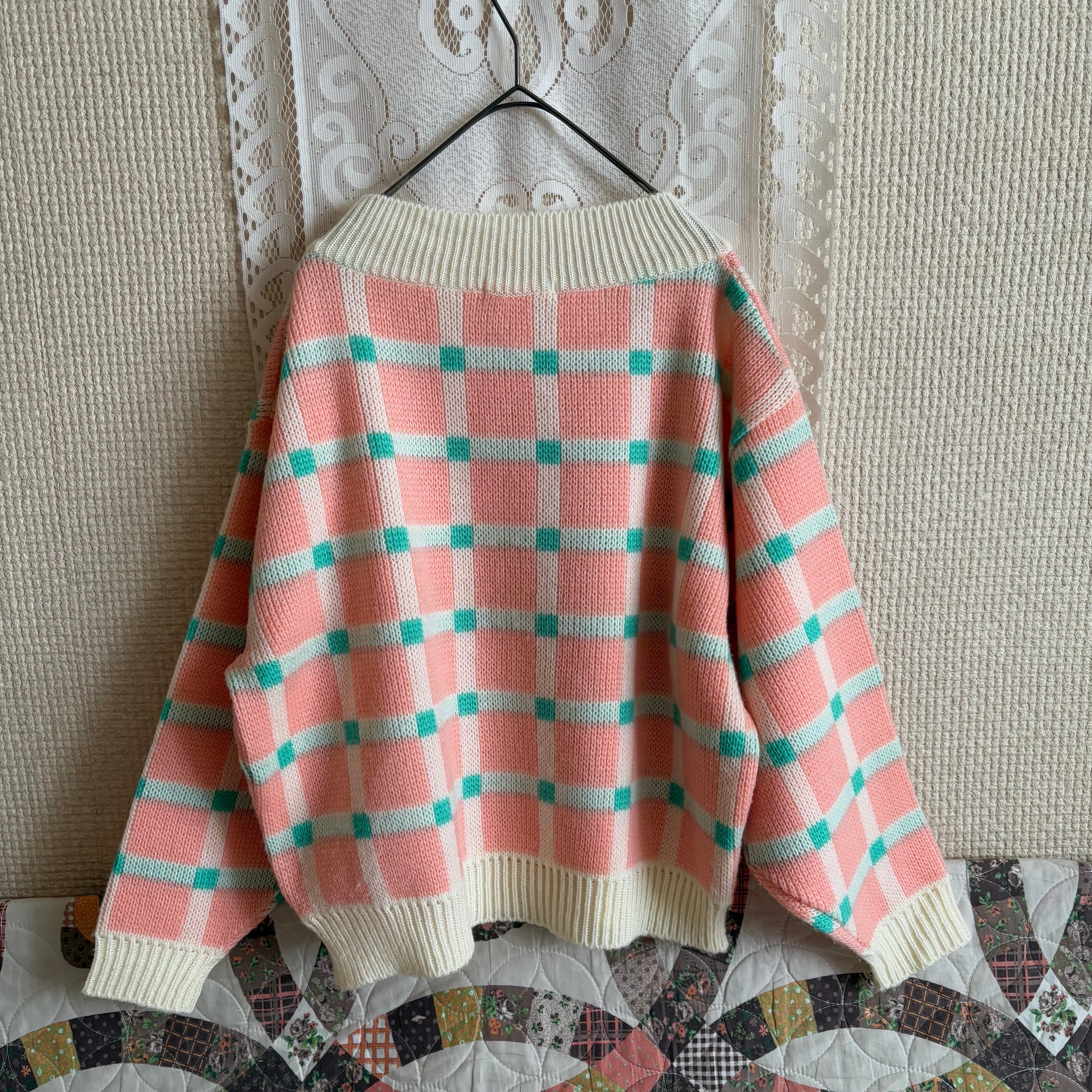 70s パステルピンク×エメラルドグリーン チェック柄 ニットセーター 昭和レトロ ヴィンテージ古着